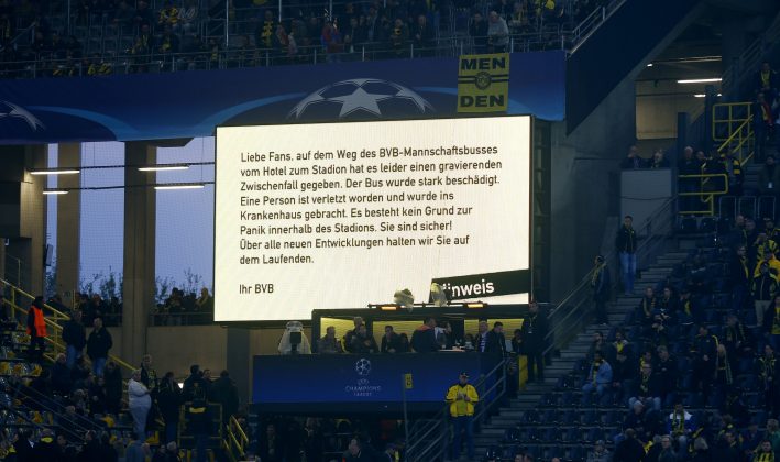 „Trys sprogstamieji užtaisai buvo detonuoti“ po 19 val. vietos (20 val. Lietuvos) laiku, kai autobusas buvo pradėjęs važiuoti į „Borussia“ stadioną, esantį maždaug už 10 km nuo viešbučio, nurodė policija.