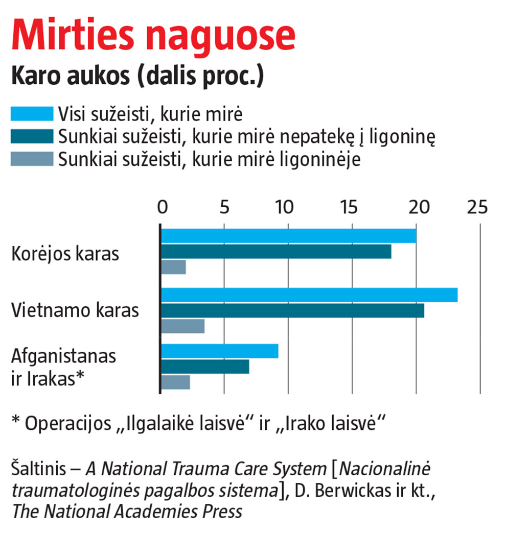 Mažesnis pavojingai sužalotų žmonių mirtingumas atspindi patobulėjusį traumų gydymą, dažniausiai remiantis mūšio lauke išmoktomis pamokomis. Per Antrąjį pasaulinį karą mirė apie 30 proc. sužeistų JAV karių. Per Korėjos karą ir Vietnamo karą – apie penktadalį (žr. grafiką). Prasidėjus operacijoms Irake ir Afganistane dalis nebesiekė nė dešimtadalio.