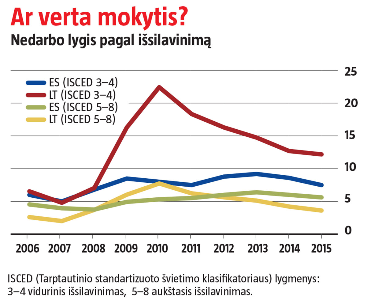 Šiandien susiduriame su įvairialypiais švietimo sistemos ir jos rezultatų paradoksais. Viena vertus, esame vieni pirmaujančiųjų Europoje pagal universitetinį išsilavinimą įgijusių gyventojų skaičių, kita vertus, ne vienas jų jau spėjo įsitikinti, kad tai negarantuoja nei didesnio atlyginimo, nei darbo vietos. Lietuvoje šiuo metu universitetines studijas siūlančių aukštųjų mokyklų – 21, jas baigusieji geba net burti iš delno. Nuolatos kalbame apie poreikį subsidijuoti studijų programas, pagal kurias ruošiami Lietuvai reikalingi specialistai, galiausiai suprantame, kad, jei taip ir toliau, nebeliks žmonių, turinčių tinkamą kvalifikaciją mokyti mūsų vaikus. Ir jiems ne pyragai – dėl vienų prasčiausių Europoje mokymosi rezultatų nuo šių metų mokykloje vaikai praleis dar daugiau laiko. Tai būtų gal ir visai neblogai, jei valstybės institucijos ir ugdymo vykdytojai rastų būdų, kaip mokyklą paversti vaikų socialines problemas mažinančia ir bendradarbiavimą skatinančia erdve. Ypač tai aktualu regionams, kuriuose iš ES lėšų ką tik sutvarkytos mokyklos vis dažniau nebesulaukia mokinių.