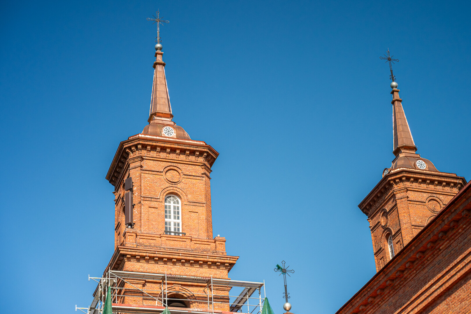 Į Panevėžį iš aukštai žvelgiantys Šv. apaštalų Petro ir Povilo bažnyčios bokštai iš tolo suspindo nauja varine danga.