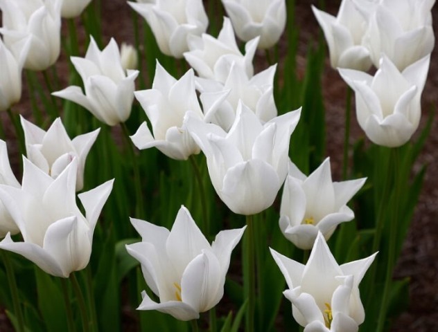 Lelijažiedžių tulpių elegancija, įsikūnijusi sniego baltumo gėlėse.