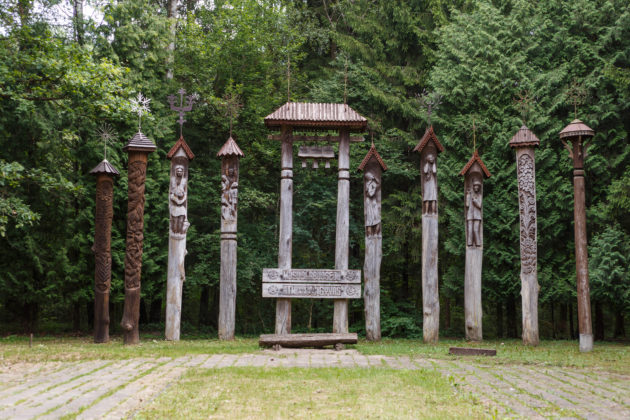 Pagal tautodailininko Kazio Nemanio eskizus paminklą kūrė 14 liaudies meistrų, vadovaujamų miesto vyriausiojo dailininko Vido Žigo. Ansamblį sudaro 11 koplytstulpių.