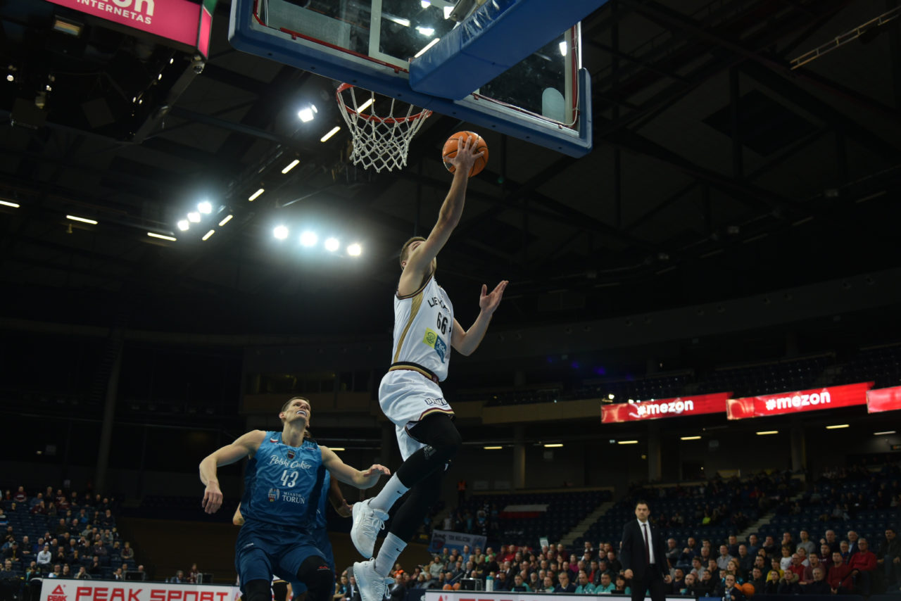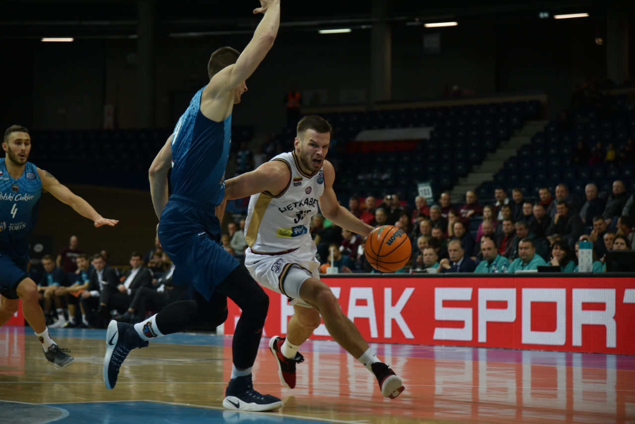 Ypač rezultatyviai prasidėjusiame mače abi ekipos daugiau dėmesio skyrė puolimui, nei gynybai. Nors Torunės ekipa išsiveržė į priekį 4 taškais (7:11), „Lietkabelis“ į tai atsakė spurtu 10:0 ir persvėrė rezultatą savo naudai – 17:11. Rezultatyvų pirmąjį kėlinį taikliu tritaškiu užbaigė Margiris Normantas – 26:23.