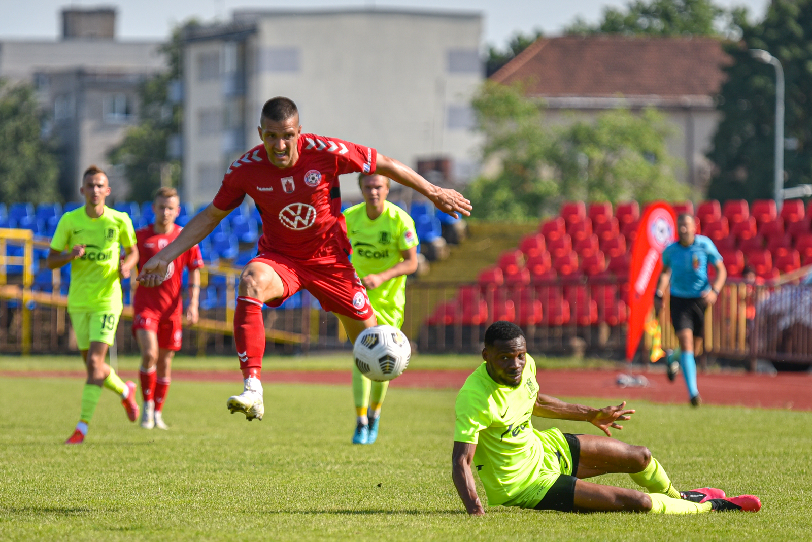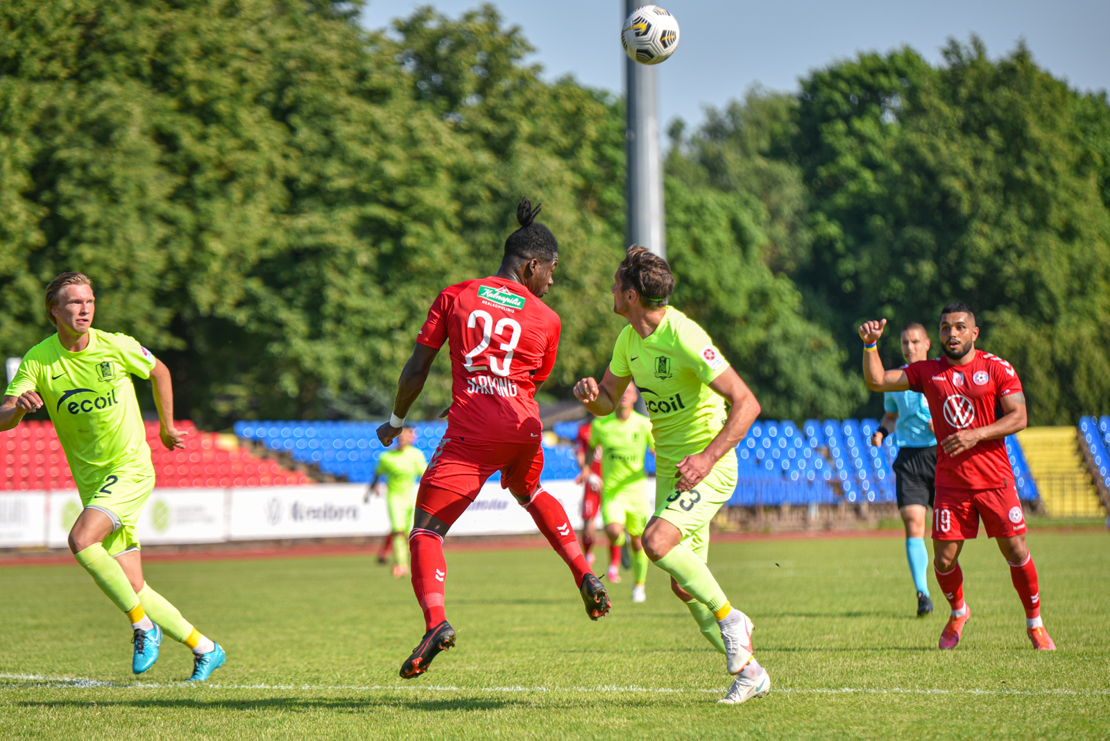 Besibaigiant pirmajam kėliniui neblogą progą pasižymėti turėjo Rafaelis Floro, bet šio žaidėjo smūgiuotas kamuolys praskriejo visiškai šalia svečių vartų virpsto.