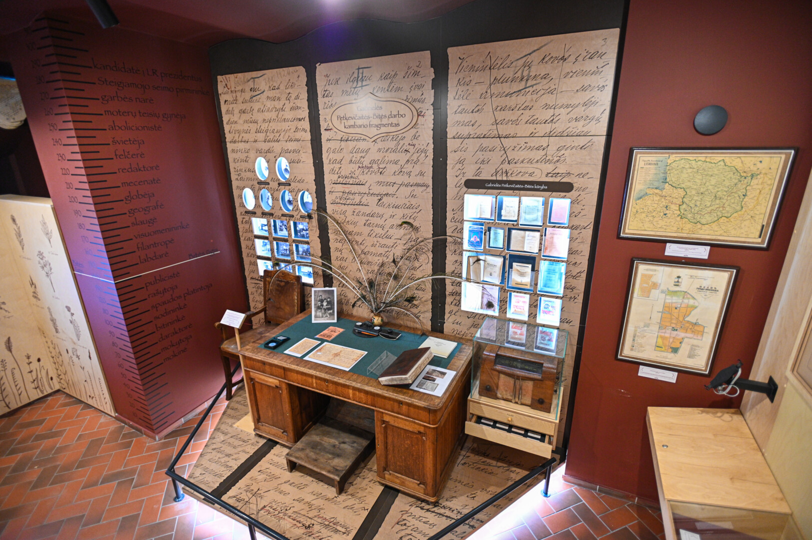 G. Petkevičaitės-Bitės stalas, krėslas, pakojis, radijo imtuvas į biblioteką atkeliavę iš rašytojos namų Panevėžyje, Šv. Zitos gatvėje.