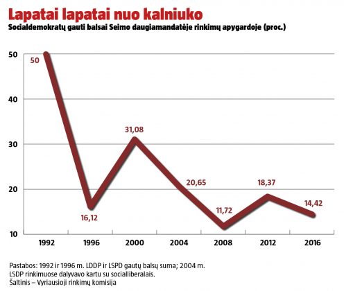 Socialdemokratų padėtis kitokia. Jie sulaukė 14,4 proc. balsų 2016 m. pirmajame rinkimų ture, ir niekas apie LSDP išnykimą negalvojo. Vis dėlto tai viena iš dviejų svarbiausių Lietuvos partijų, nuolat su konservatoriais besivaržančių dėl to, kas dominuos formuojant valdančiąją koaliciją. Tačiau prarastas toks įprastas statusas po 2016 m. Seimo rinkimų socialdemokratus ypač sukrėtė. Per ketverius metus valdžioje, kai LSDP visada pirmavo partijų populiarumo apklausose, neteko 68 tūkst. rinkėjų, arba beveik trečdalio ją palaikiusių 2012-ųjų rinkimuose. Pagal mandatų skaičių LSDP nuostoliai dar skaudesni – vietoj 40 liko 19.