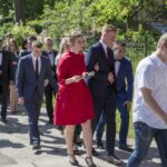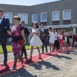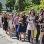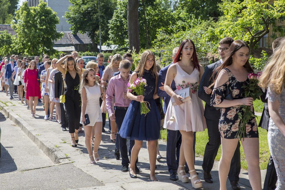 Didinga abiturientų kolona nuo 5-osios gimnazijos šiandien traukė Panevėžio muzikinio teatro link. Čia dar prieš pasirodant abiturientams lūkuriavo gėlių puokštėmis nešini artimieji. Netrukus būgnų garsai atlydėjo gimnazijos vadovus, šalia žygiavo ir Panevėžio miesto meras Rytis Mykolas Račkauskas, o už jų – saulės spinduliuose skęstantys moksleiviai.