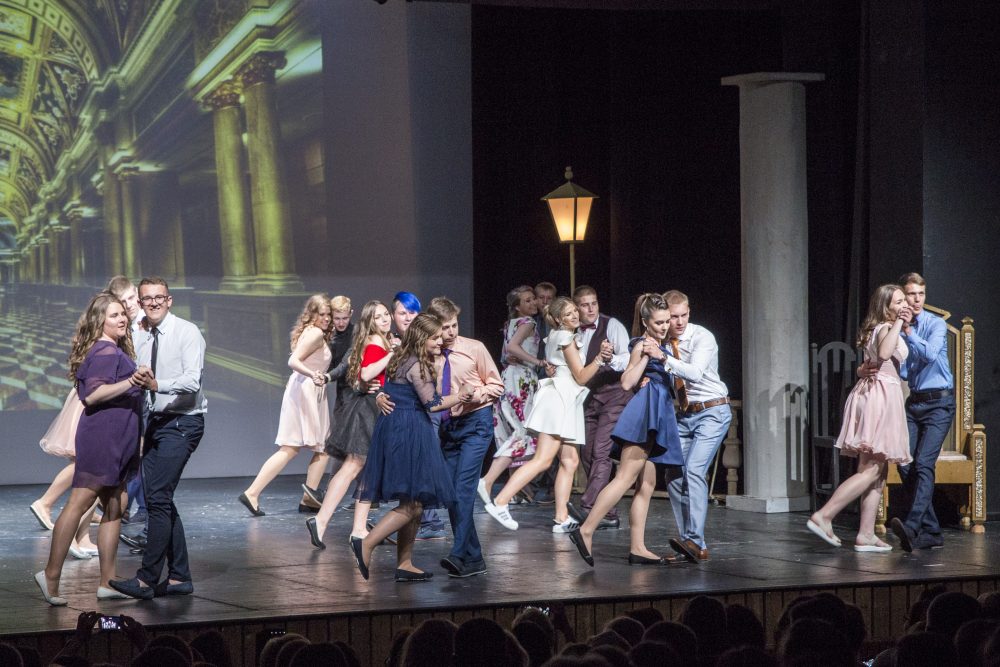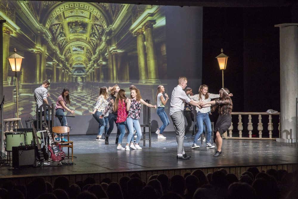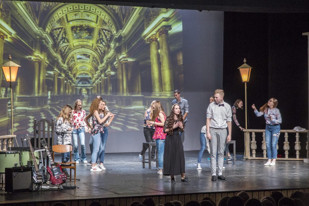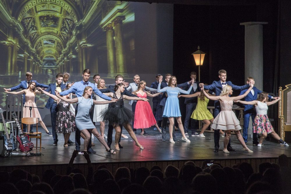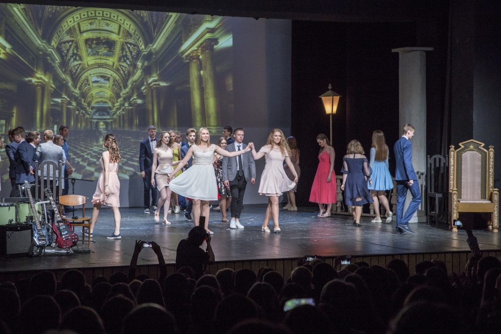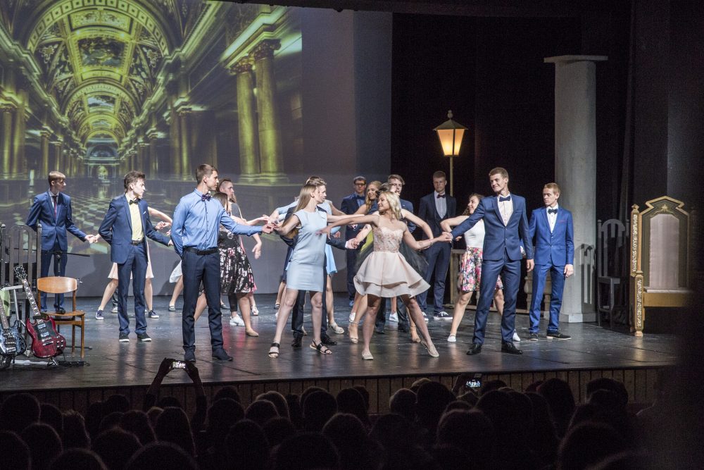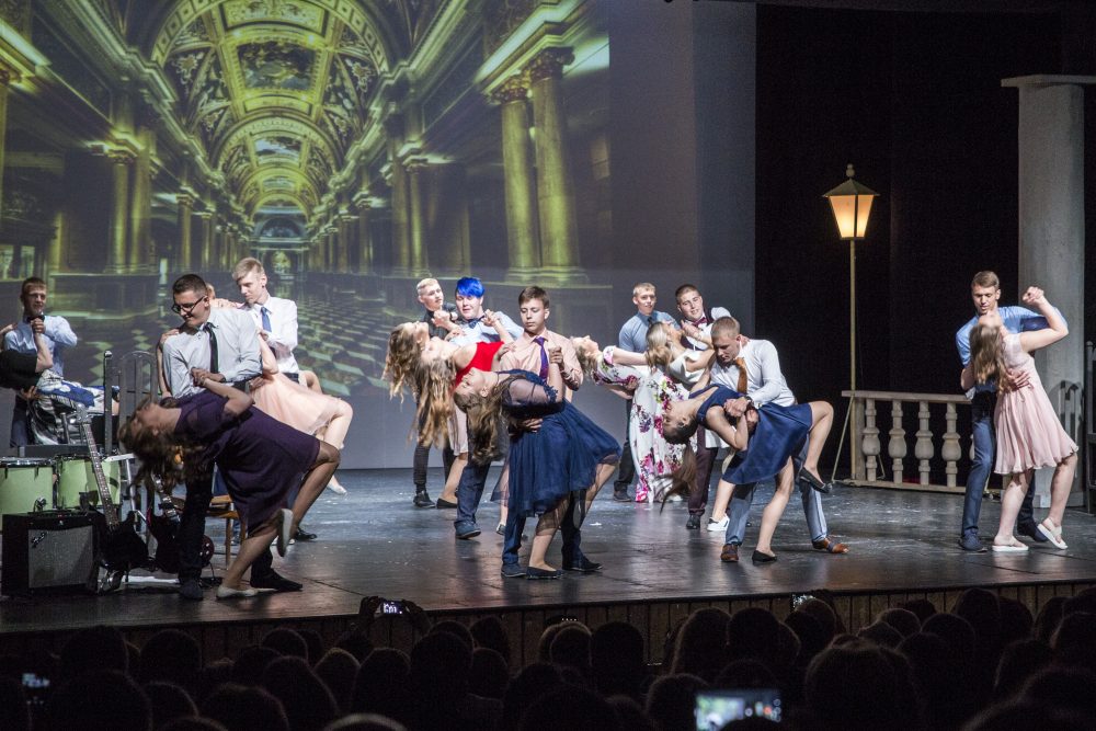 Išskirtinei progai parengtas specialus spektaklis. Jo metu pasirodė jaunesniųjų klasių mokiniai, ekrane mokytojai siuntė dabar jau buvusiems mokiniams linkėjimus ir sveikinimus, skambėjo dainos, pritariant gitarai. Šventės akcentu tapo abiturientų klasių prisistatymai šokio ritmu. Mokiniai sukosi tiek lyriškos, tiek audringos muzikos fone. Pasirodymus lydėjo audringi plojimai ir pasigėrėjimo šūksniai.