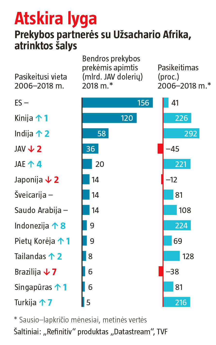 Galimybė pasiekti Afrikos gamtos išteklius išlieka svarbi. Bet ekonominiai ryšiai anaiptol neapsiriboja žaliavomis. TVF suskaičiavo, kad trečdalis Užsachario Afrikos šalių šiemet gali tikėtis daugiau kaip 5 proc. BVP augimo. Verslo asociacijos GSMA vertinimu, artimiausius penketą metų mobiliojo ir duomenų ryšio abonentų skaičius kasmet padidės beveik 5 proc., t. y. augs dvigubai sparčiau nei pasaulio vidurkis, beveik 300 mln. afrikiečių iki 2025 m. įžengus į internetą.