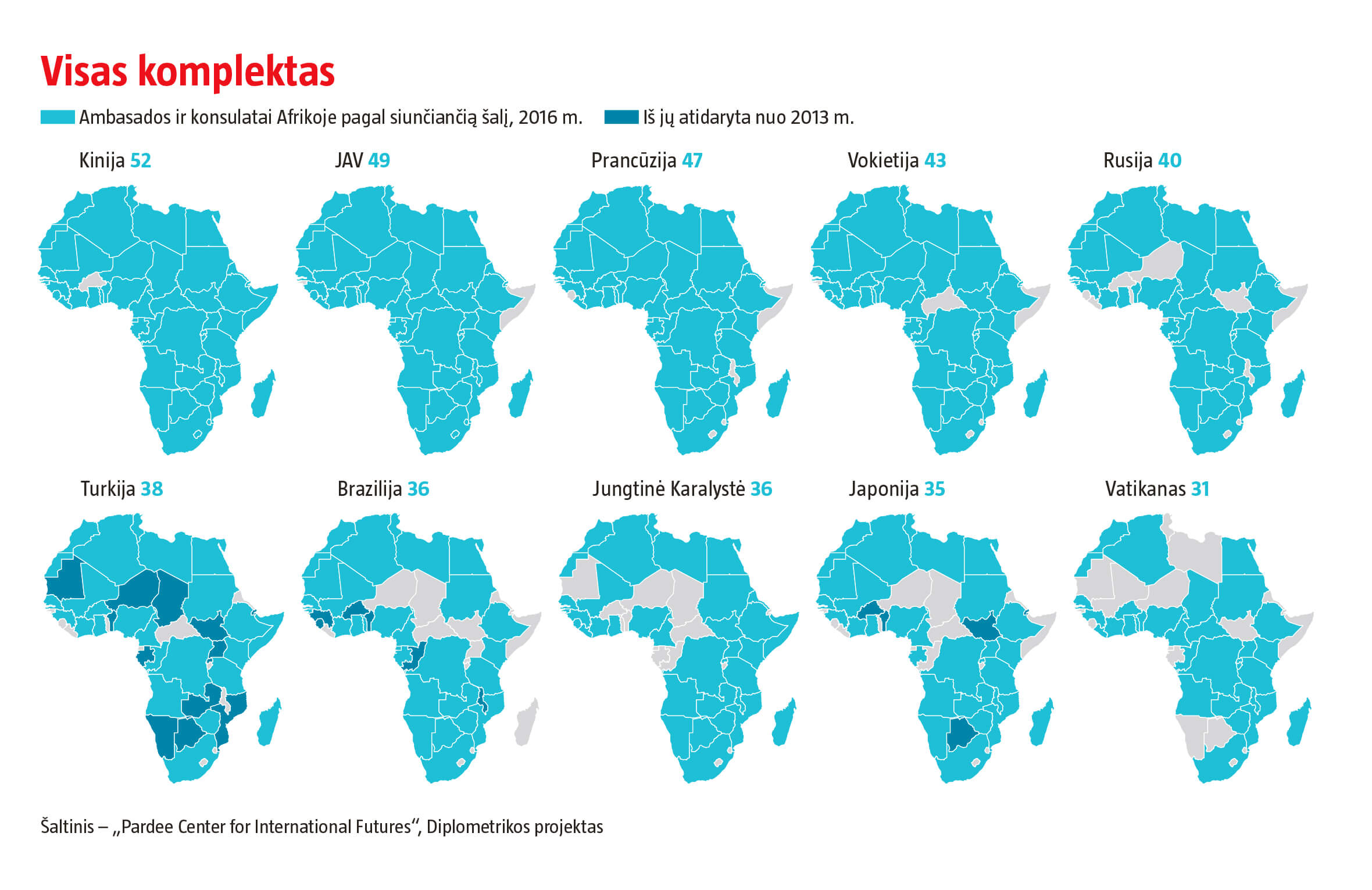 Denverio universiteto Diplometrikos projekto duomenimis, 2010–2016 m. Afrikoje atidaryta daugiau kaip 320 ambasadų arba konsulatų. Vien Turkija įsteigė 26 (žr. žemėlapius). Bumas nesibaigė. Pernai Indija pranešė ketinanti atidaryti dar 18. Prie diplomatinių pastangų prisideda užsienio šalių vadovai. Šiemet Rusijos prezidentas Vladimiras Putinas planuoja pirmąjį Rusijos ir Afrikos viršūnių susitikimą, panašų į kas trejus metus Pekine vykstantį Afrikos ir Kinijos bendradarbiavimo forumą (FOCAC). Pernai forumas, kuriame svečius sutiko prezidentas Xi Jinpingas, sutraukė daugiau Afrikos šalių vadovų nei kasmetis JT Generalinės Asamblėjos suvažiavimas. Artimiausiais mėnesiais susitikimus taip pat rengia Japonija ir Jungtinė Karalystė.