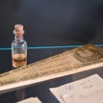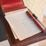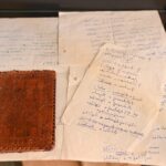 Ten pat ir sukarpyto popieriaus lapeliai, ant kurių jo ranka užrašyti žodžiai. Taip pat – dvi odiniais viršeliais garsiojo ėriškiečio užrašų knygelės ir rašalu rašantis rašiklis.