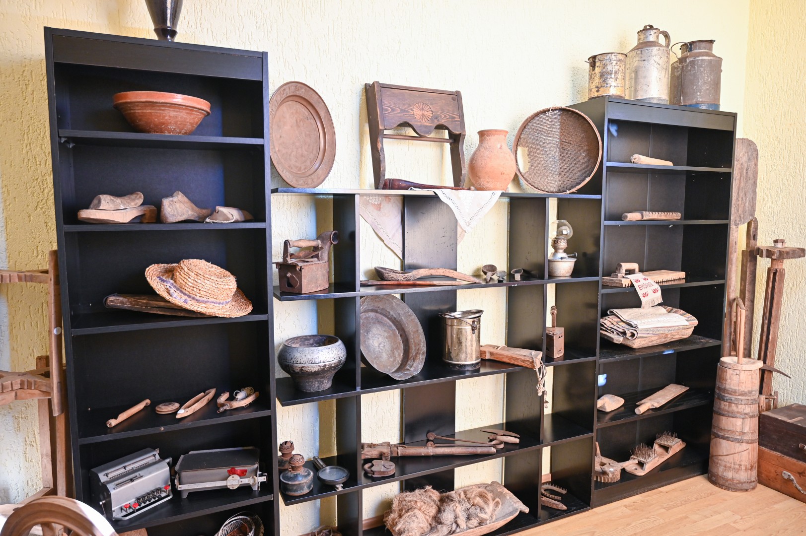 Kiti eksponatai įprastesni: žibalinės lempos, anglimi įkaitinamas lygintuvas, sietas ir gelda su sudėtais linų pluošteliais.