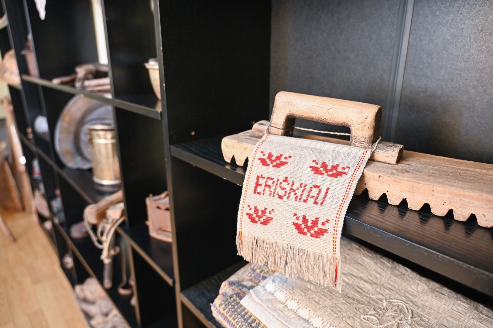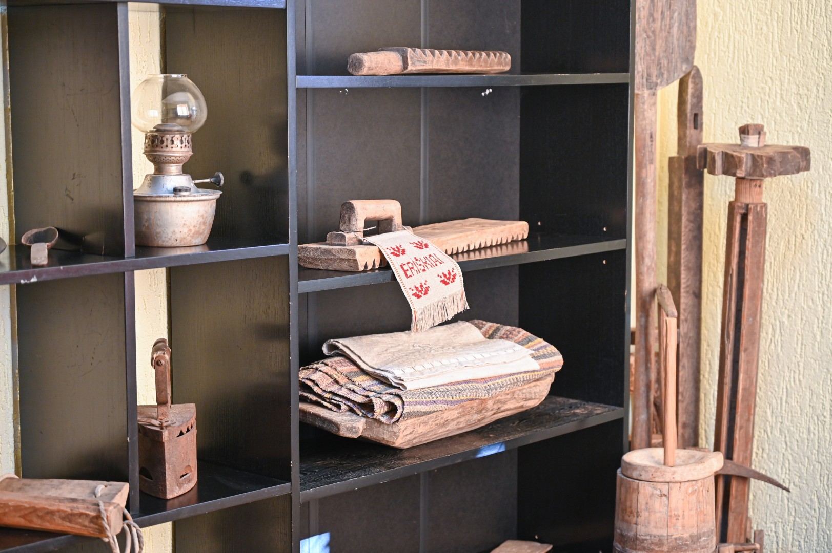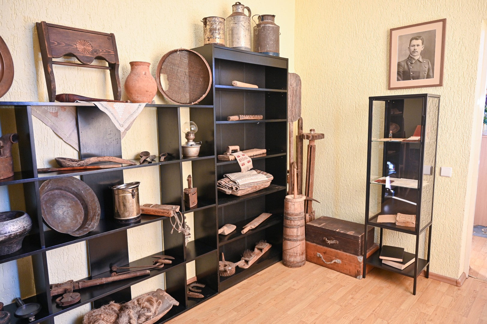Kiti eksponatai įprastesni: žibalinės lempos, anglimi įkaitinamas lygintuvas, sietas ir gelda su sudėtais linų pluošteliais.