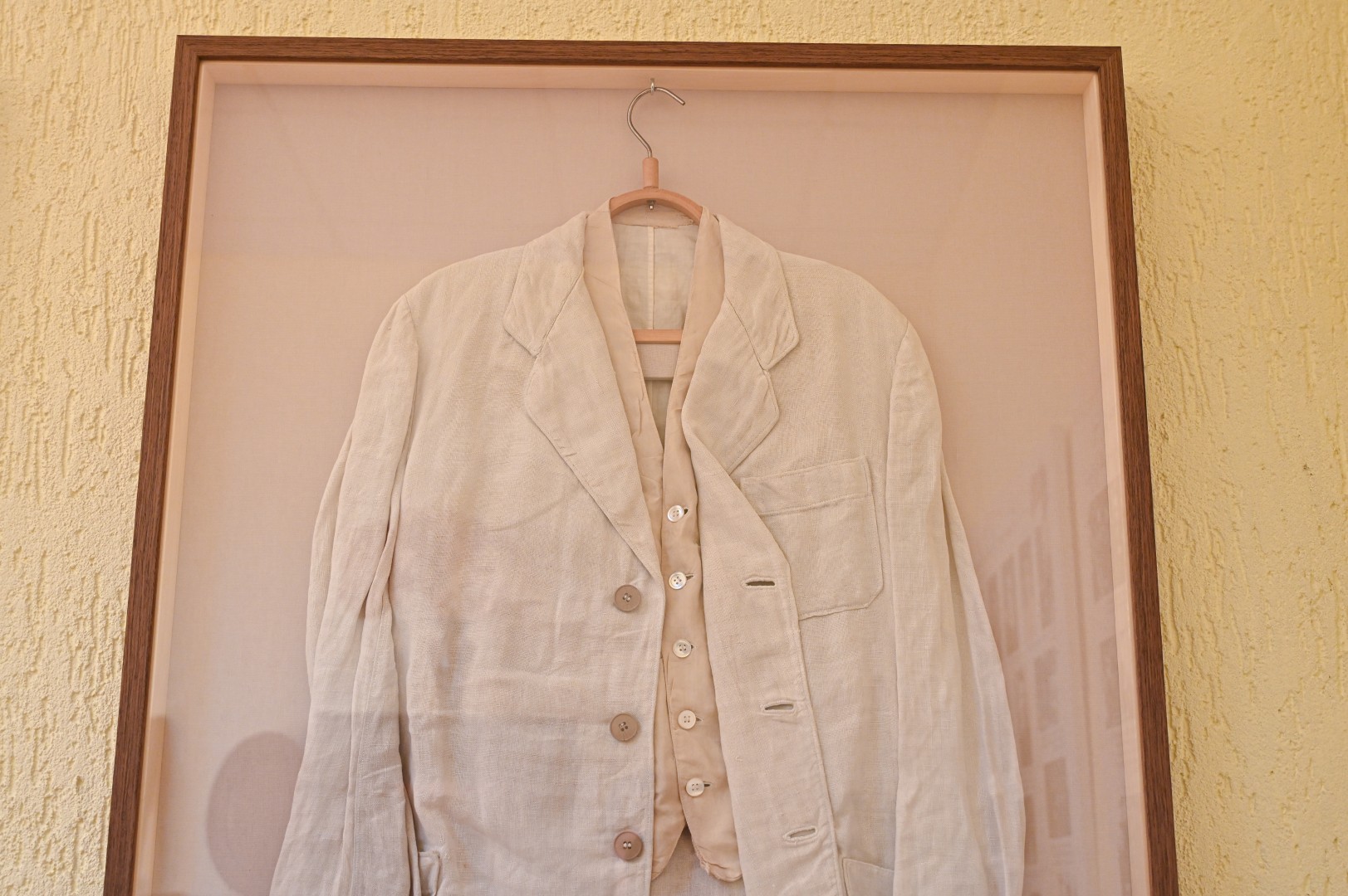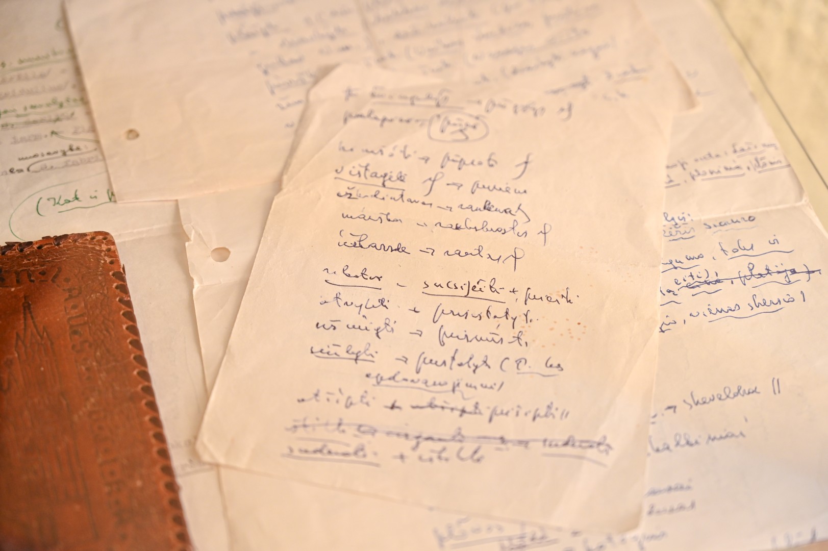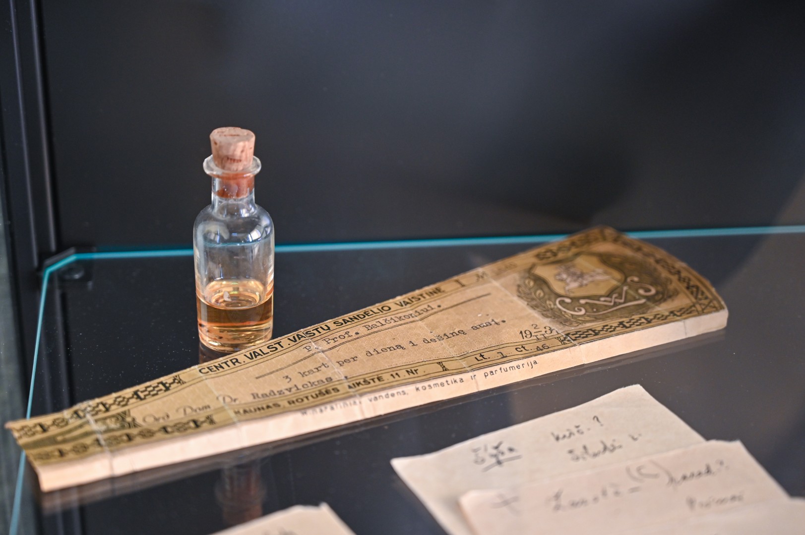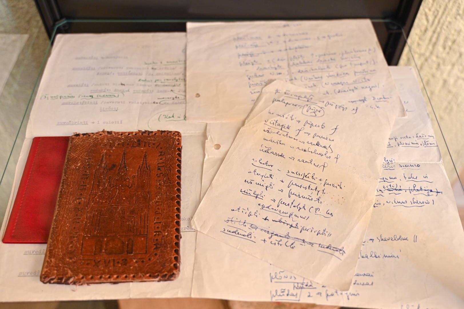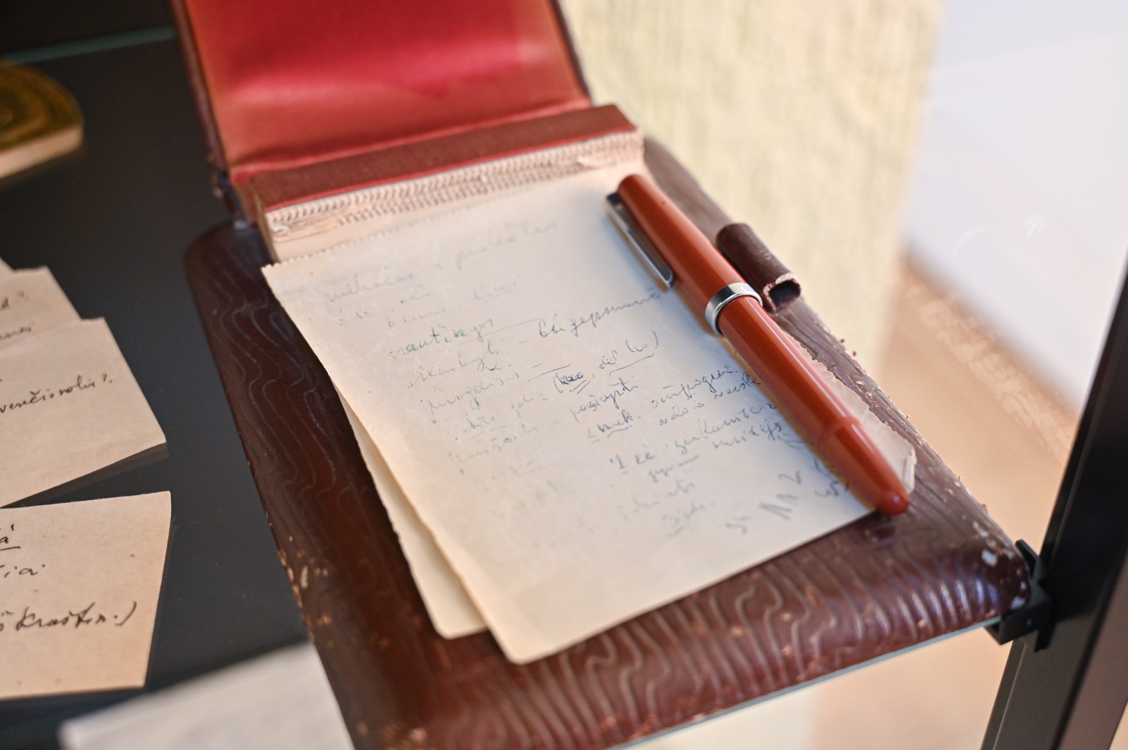 Ten pat ir sukarpyto popieriaus lapeliai, ant kurių jo ranka užrašyti žodžiai. Taip pat – dvi odiniais viršeliais garsiojo ėriškiečio užrašų knygelės ir rašalu rašantis rašiklis.