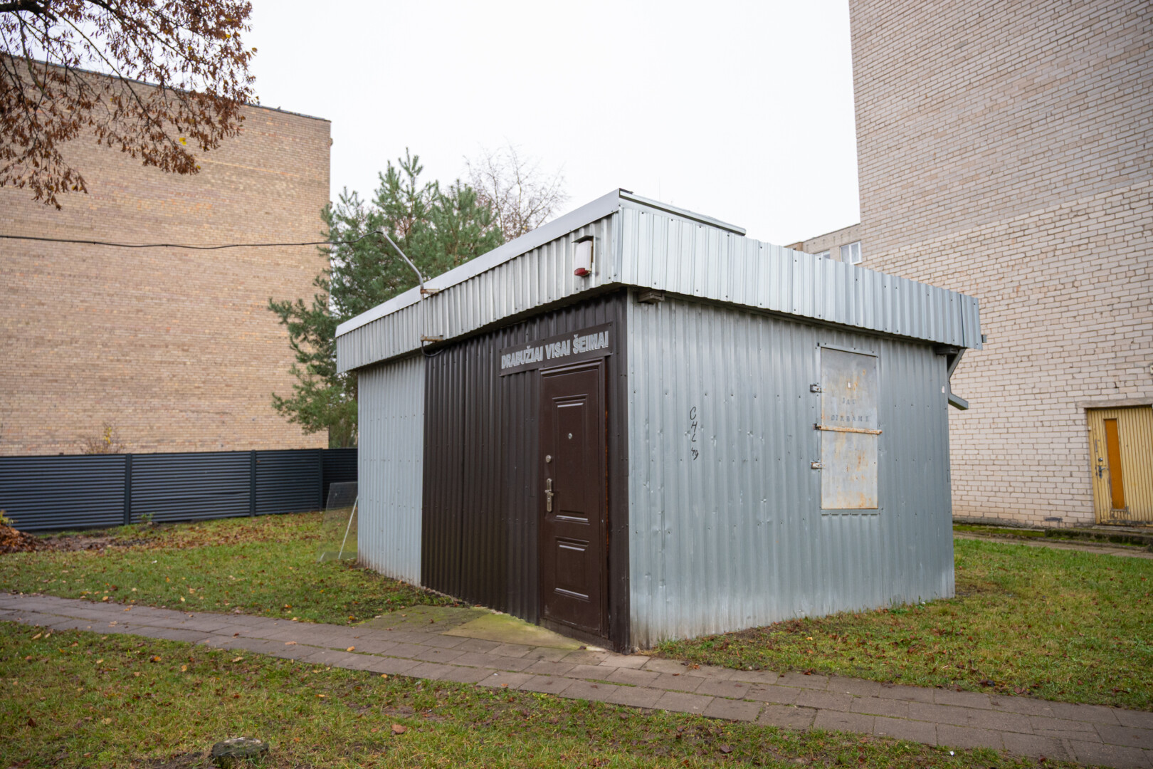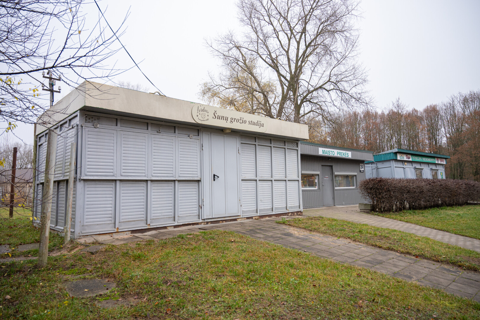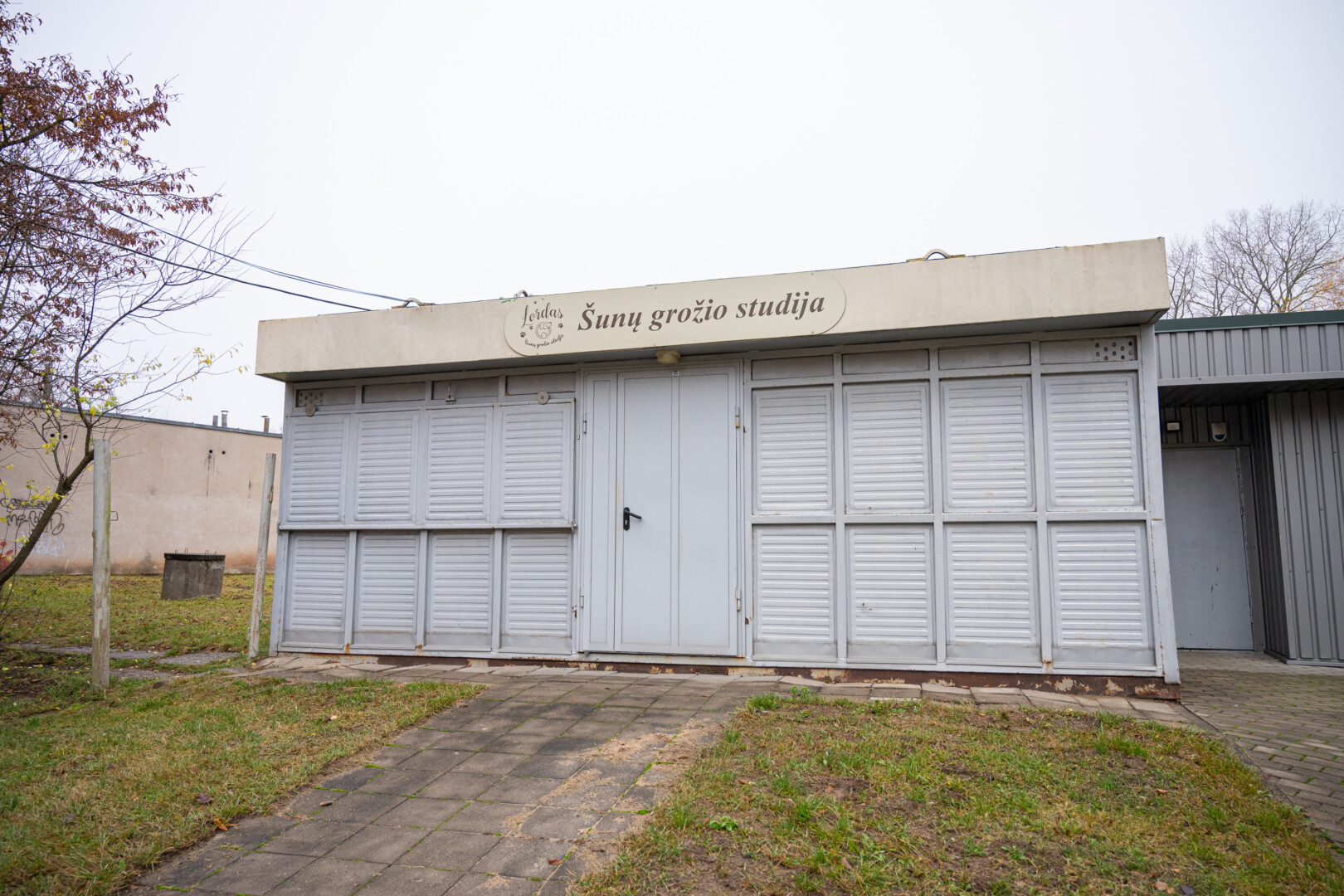Prie užrakinto, kurio duris jau aptraukė rūdys, pritvirtintas užrašas skelbia, kad čia turėtų veikti šunų grožio salonas „Lordas“.