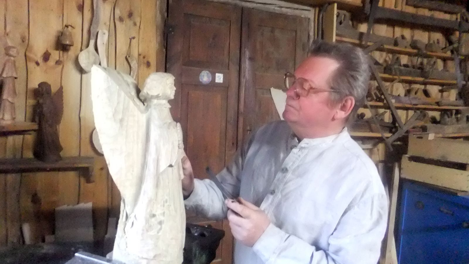 Iš kiek apdžiūvusio medžio jau ir keletas rūpintojėlių, angelų išdrožta – tokia kūryba, sako, ypač įkvepianti ir pakylėjanti.