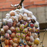 Anksčiau Vydūno gatvėje esančių A. Ladavičienės namų kieme jos išmargintais kiaušiniais buvo apkabinėjama suaugusi obelis ir dvi obelaitės. Šiemet kiemo vaizdas kitoks: margučių kompozicijos kabo ant obels, jų vėriniais nukabinta ir namo siena per abu aukštus.