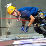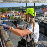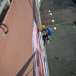 Nuo ankstyvo ryto ketvirtadienį ant trylikaaukščio pastato fasado darbavosi 3,5 m. pločio ir 5,5 m ilgio fotografijas kabinantys aukštalipiai.