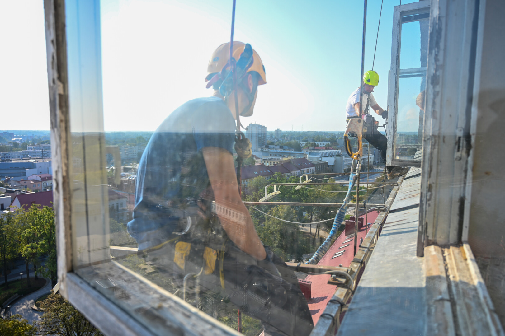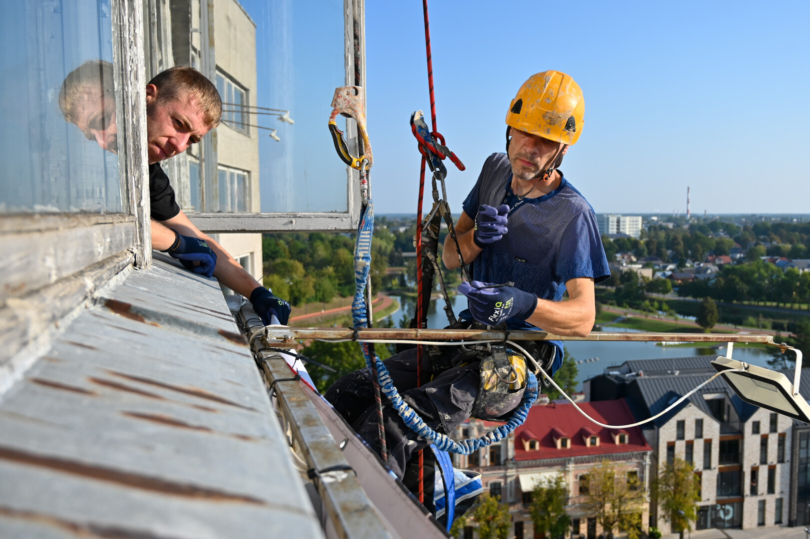 Nuo ankstyvo ryto ketvirtadienį ant trylikaaukščio pastato fasado darbavosi 3,5 m. pločio ir 5,5 m ilgio fotografijas kabinantys aukštalipiai.