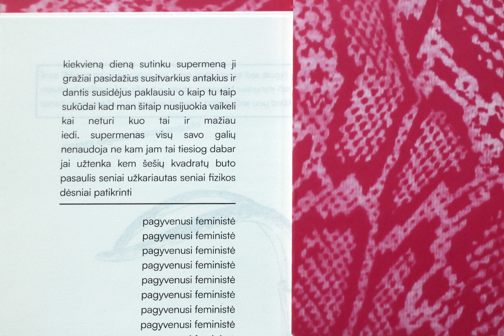 „Grafiniu dizainu rūpinosi Rokas Bilinskas. Studentas ir rašytojas. Tad rasti bendrą kalbą puikiai pavyko. Galvodama apie dizaino variantus, jam siunčiau mėgstamų lūpų dažų, drabužių spalvas ir raštus. Taip atsirado rožinė ir balta. Viršelis atsiveria ir kaip gyvatė išsineria“, – sako.