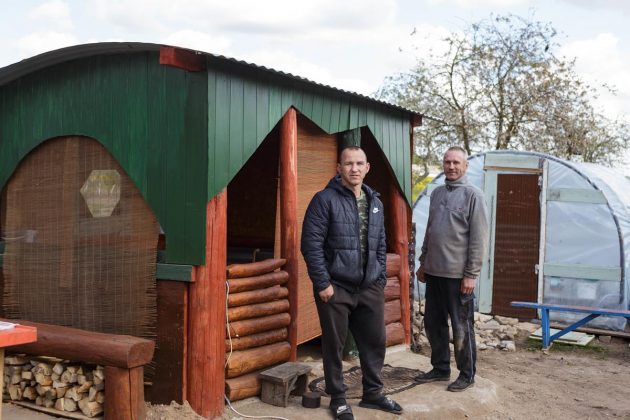O štai Robertas Balsevičius, kaimyno Sauliaus Leko padedamas, ir jaukią pavėsinę įsirengė.