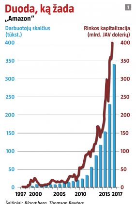 „Amazon“, akcijas į biržą paleidusi prieš 20 metų, dabar yra penkta pasaulyje pagal vertę, kuri viršija 400 mlrd. JAV dolerių (žr. 1 grafiką). Bendrovės e. komercijos svetainė JAV susirenka apie 5 proc. mažmeninei prekybai tenkančių išlaidų – maždaug perpus tiek, kiek gauna „Walmart“, didžiausia sektoriuje. „Amazon“ – stambiausia internetinė mažmenininkė JAV, jai tenka daugiau kaip pusė visų naujų išlaidų. Bendrovės debesų kompiuterijos padalinys „Amazon Web Services“ (AWS) pagal pagrindines kompiuterijos paslaugas lenkia tris artimiausius konkuruojančius debesijos paslaugų pasiūlymus imant kartu.