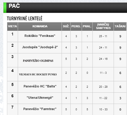 Įsibėgėjusiose pirmenybėse geriausiais sekasi Rokiškio „Fenikso“ ir Juodupės komandoms, kurios po 4 rungtynių savo sąskaitoje turi po 9 taškus. Trečioje vietoje lyderiams į nugarą alsuoja „Olimpo“ ledo ritulininkai, kurie po 5 rungtynių savo sąskaitoje turi 3 pergales ir 2 nesėkmes (9 taškai).