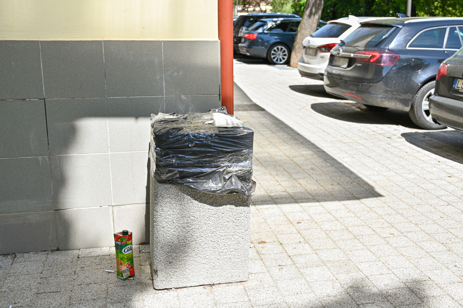 Sustatytos naujos šiukšlių dėžės buvo apklijuotos plėvele, bet tikriausiai patys žmonės ją nuplėšė – juk jeigu yra šiukšliadėžė, kodėl negalima ja naudotis?