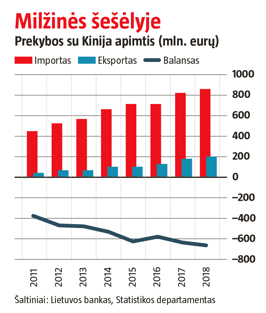 Vis dėlto prekybos balansas yra ne Lietuvos naudai. Statistikos departamento duomenimis, 2018 m. importo iš Kinijos vertė buvo 855,3 mln. eurų. Didžiausią importo dalį sudarė elektros mašinos, įrenginiai ir jų dalys (19 proc.), mechaniniai įrenginiai (15 proc.), baldų dalys (5 proc.). Tačiau priklausomi nuo kiniškų prekių dar nesame – jų dalis siekė vos 2,8 proc. viso Lietuvos importo.