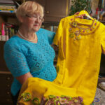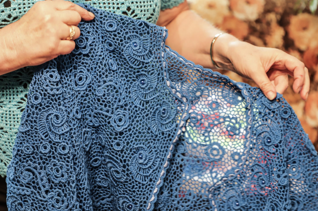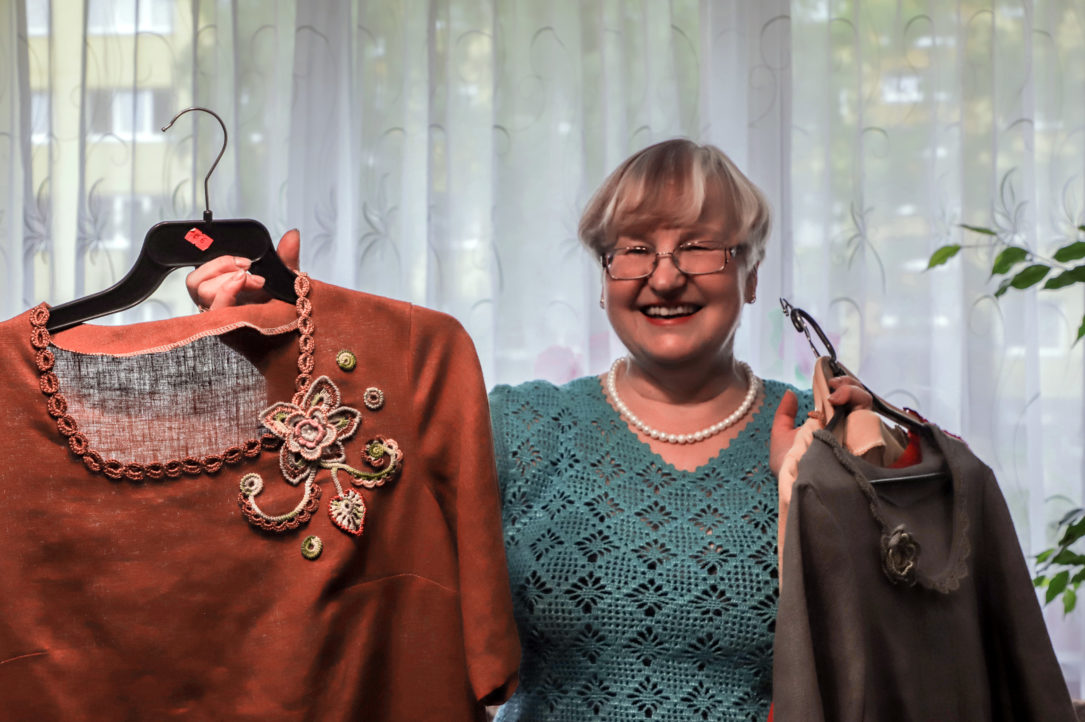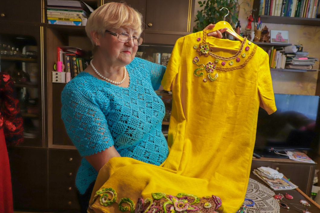 „Ją nusimezgiau prieš keturiasdešimt metų pasipuošti per sesers vestuves. Ir štai, matote, kokia lino vertybė – iki šiol liko tokia, kaip buvusi. Ne kartą ją parduoti prašė, bet kažkaip neišdrįsau su ta suknele skirtis“, – pasakoja mezgėja.