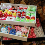 Dar bent trys dėžės prikrautos įvairiausių puošmenų mergaitėms į plaukus. Pradėjus kurti dovanas anūkėlėms, patiko šis įdomus procesas ir Elvyra įsitraukė į spalvų, kaspinų, karoliukų, sagyčių, juostelių ir gumelių žaidimą. Ir dabar net akys raibsta nuo tokio grožio.