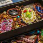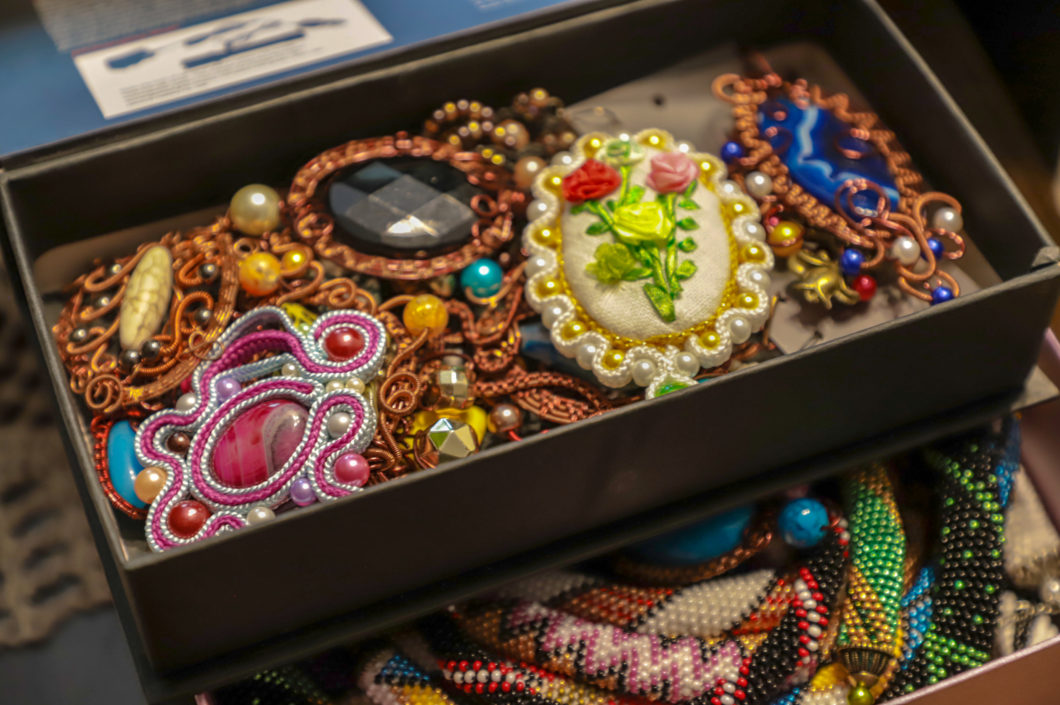 Čia įvairiausios pirštinės – ir storos vilnonės raštuotos, ir plonytės lininės pirštuotos, karoliukais siuvinėtos, prie puošnių drabužių derinamos. Kitoje dėžėje – megztos ir nertos rankinės, tautiniais raštais išrašytos, karoliukais ar siūlais siuvinėtos, įvairių formų, dydžių ir spalvų.