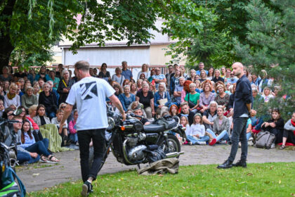 Gatvės ir pasakojimo spektaklis „Stepai, gazo!“ miesto centre, ant žolės. Aleksandras Špilevojus,…