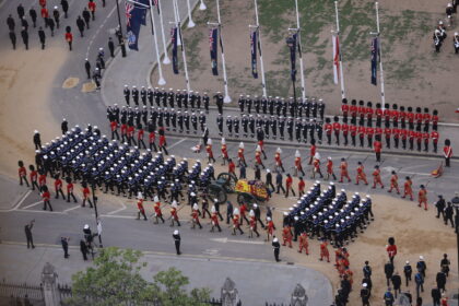 Jungtinės Karalystės (JK) karalienės Elžbietos II karstas išneštas iš Vestminsterio abatijos Londone,…