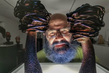 Atėjusieji su 60-uoju jubiliejumi pasveikinti meninio stiklo virtuozo panevėžiečio Remigijaus Kriuko iš…