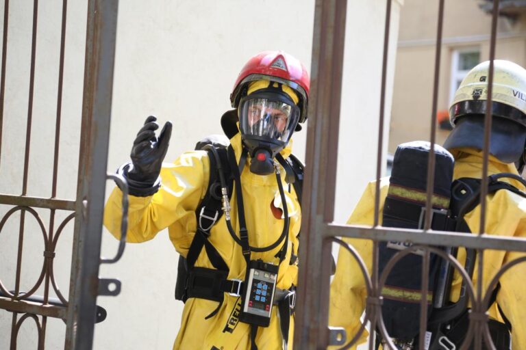 Nemenkos specialiųjų tarnybų pajėgos sulėkusios į Parko gatvę Panevėžyje gesinti dūmuose skęstančio…