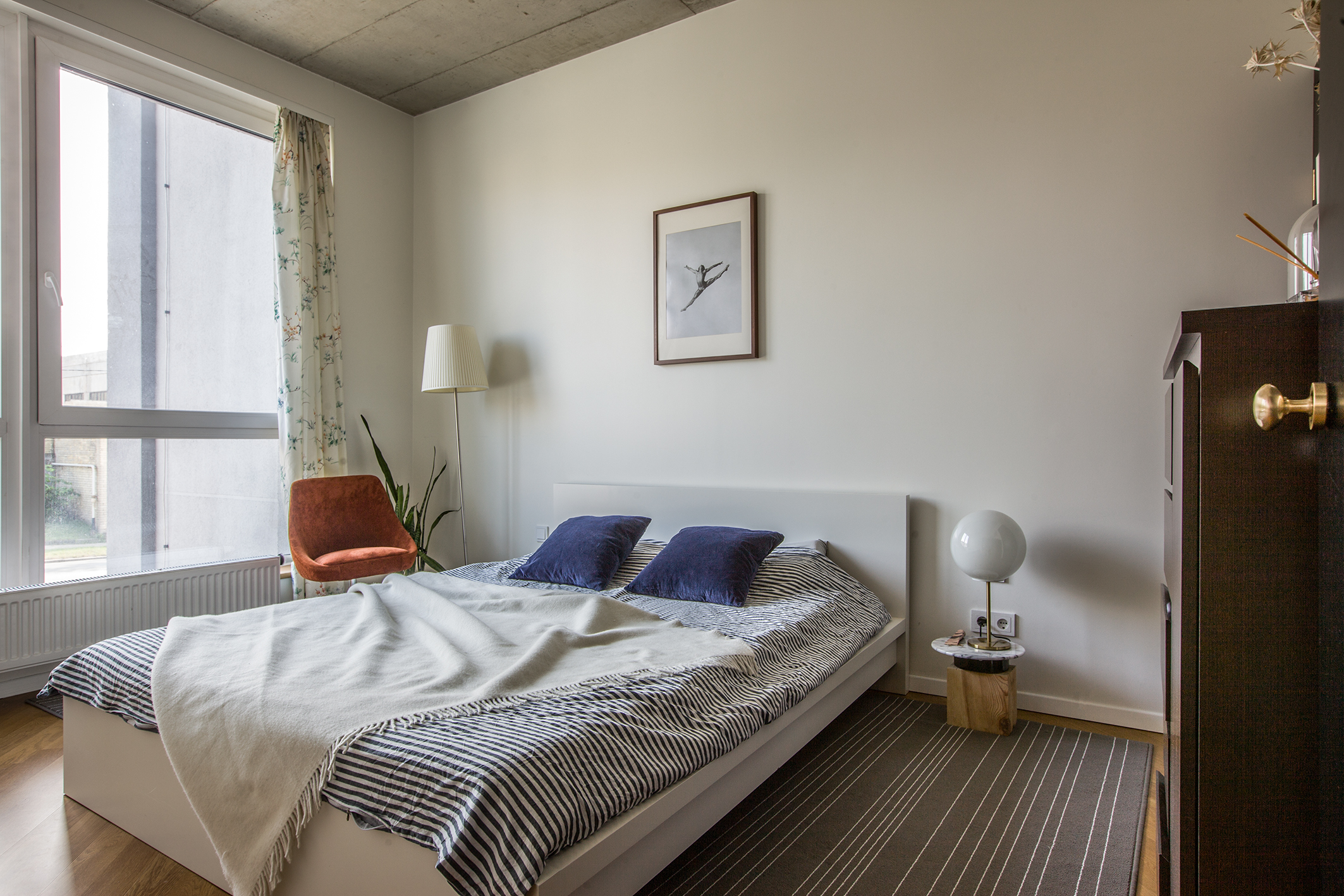 Ištikimybė savo skoniui ir stiliui lėmė, kad įvairiais keliais namus pasiekę ir skirtingomis istorijomis nešini daiktai sugulė į darnią kompoziciją. Pavyzdžiui, keturias valgomojo kėdes pora įsigijo visai neplanuotai, užsukusi į vieną vintažinių ir antikvarinių daiktų parduotuvę Birštone. Fotelis, kuriame įsitaisius jauku skaityti, anksčiau stovėjo būsto savininko biure. Moderni chromuoto metalo kėdė – iš salono „The Chairs“, o štai dvi ilgakojes spinteles, ant kurių dabar stovi garso aparatūra ir įvairios jaukios detalės, jie aptiko naršydami skelbimus internete. „Abi spintelės, kurių tikroji funkcija iš tiesų yra patalynės dėžės, šiuose namuose buvo pirmieji mūsų įsigyti baldai. Dar beveik nieko neturėjome, bet ant jų laiminga dėliojau kalėdines kompozicijas“, – juokiasi moteris.