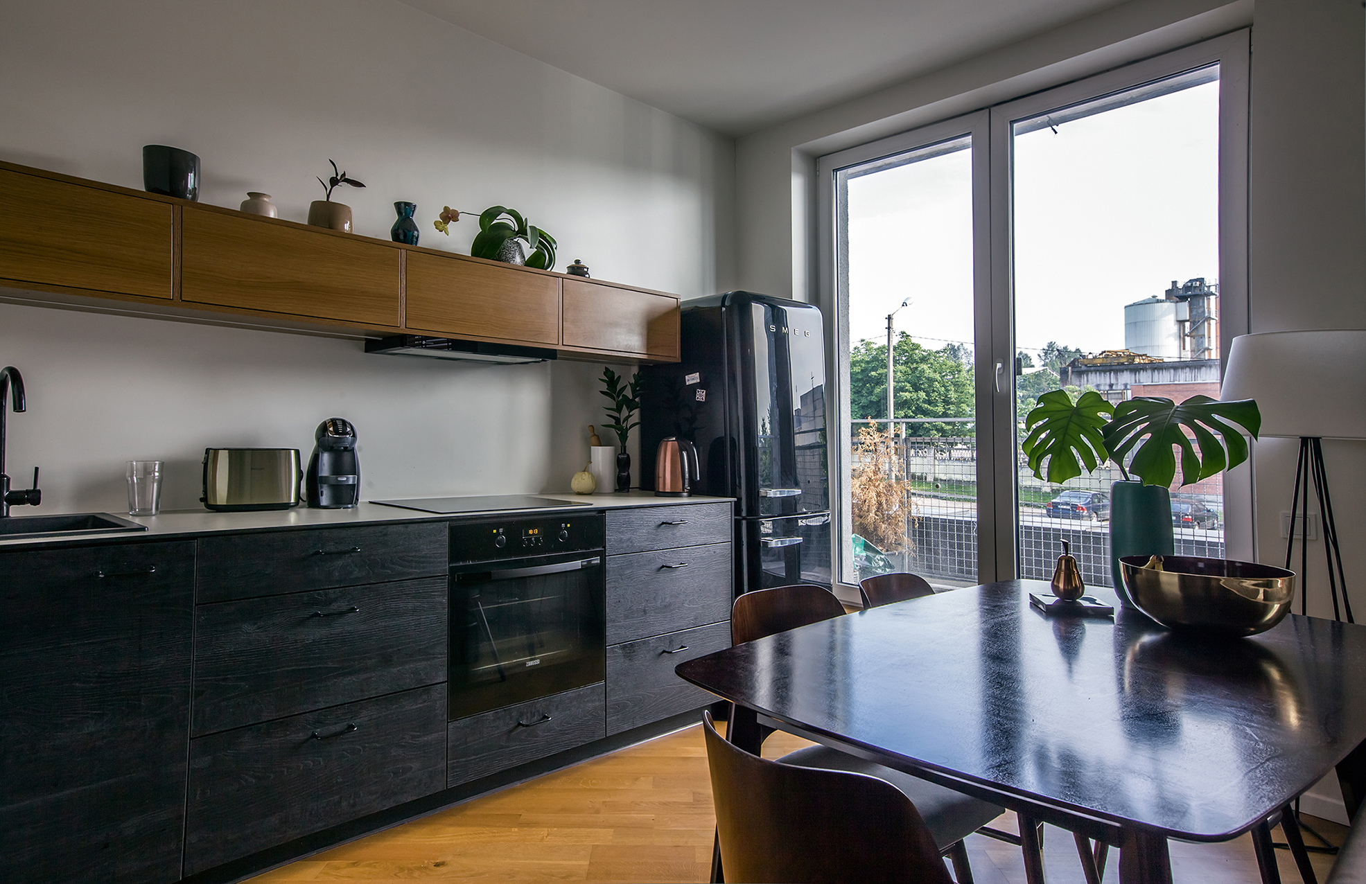 „Atsikraustydama žinojau, kad namuose norėsiu būtinai juodų durų, medinių žaliuzių ir juodo „Smeg“ šaldytuvo. O visa kita rinkomės, dairėmės, kaupėme pamažu. Čia įsikraustėme tik su kalnu dėžių ir dviem taburetėmis“, – šypteli N. Sanajevienė. Iš ankstesnio būsto šeima nepasiėmė beveik nieko, todėl visus baldus, detales, interjero elementus rinkosi taikydama būtent šiems namams.