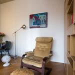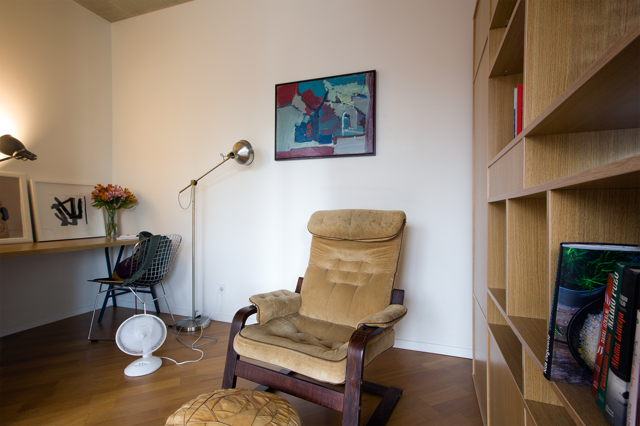 Pačių suprojektuotoje pertvaroje-lentynoje į akis krinta Stasio Krasausko grafikos albumas – dar vienas praėjusio šimtmečio vidurio dvasia alsuojantis reliktas. N. Sanajevienė neslepia, kad šio menininko kūryba jai labai artima. Darbo zonoje įrėminta pora grafikos darbų – pačios Neretos žaidimai linijomis ir formomis.