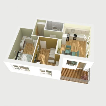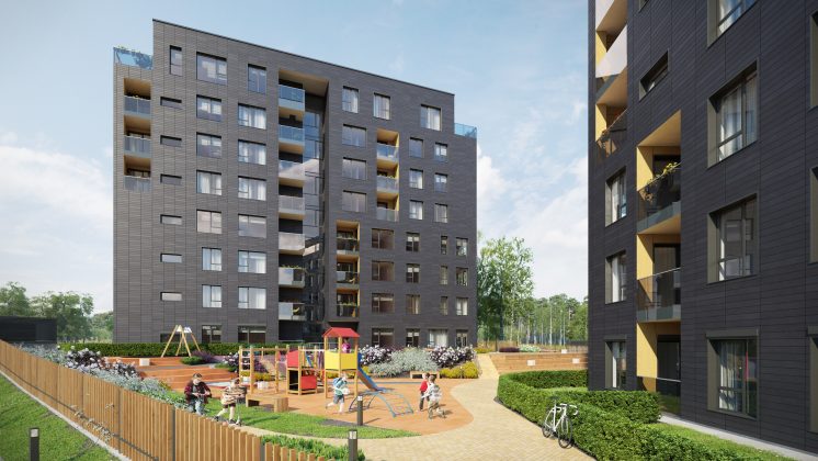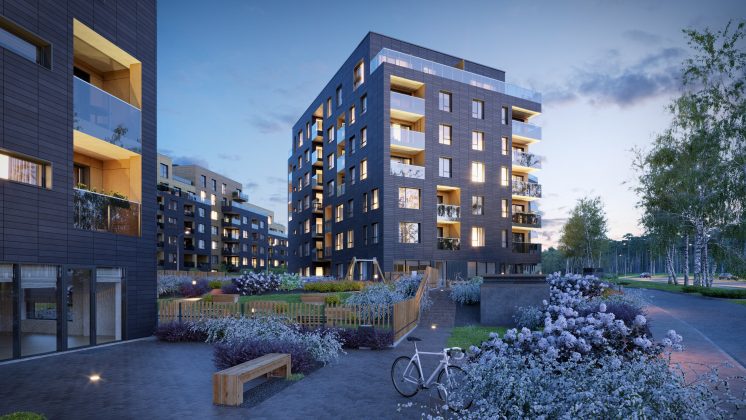 Fasadai dengiami aukštos kokybės ir puikiai šilumą izoliuojančiomis vokiškomis keramikos plokštėmis. Pietinėje namų pusėje įrengta saulės poveikio kontrolės sistema, palaikanti optimalią patalpų temperatūrą.
