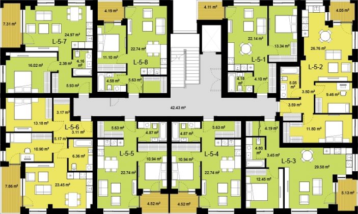 2 kamb.: 43–55 m2