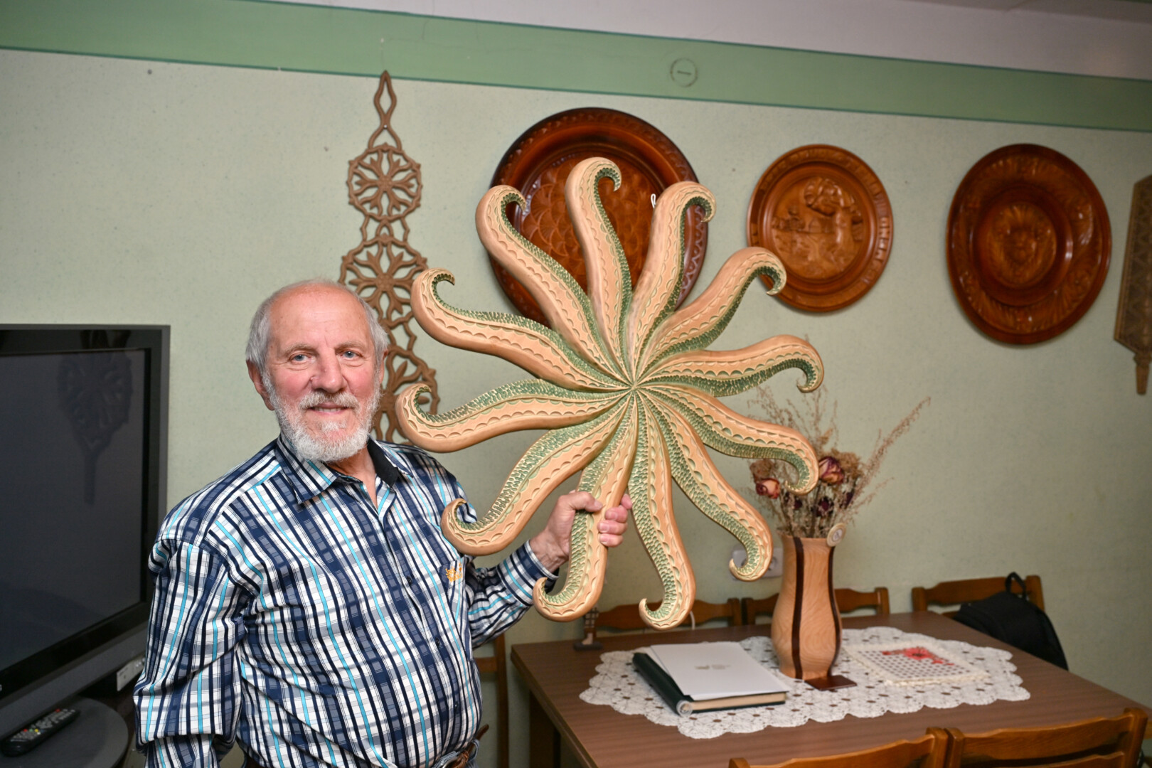 Nagingo meistro namų sienas puošia niekur kitur nematytos medinės saulutės, įspūdingos verpstės, kiti kūriniai.