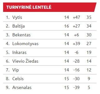 „Vyčiui“ (35 tšk.) tai buvo pirmoji nesėkmė šiame sezone, o „Bekentas“ (30 tšk.) iškovojo 14 pergalę. Iki sezono galo likus dviem turams, vilniečiai turi teorinę galimybę aplenkti pirmaujantį Kauno klubą bei aplenkti „Baltiją“. „Bekentas“ kitas rungtynes išvykoje žais su „Inkaru“, o „Vytis“ namuose priims Radviliškio „Lokomotyvą“.