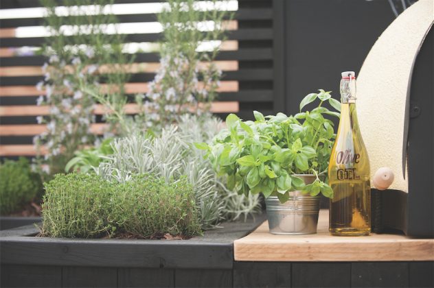 Vasaros svetainėje Victoria sukūrė jaukią kaimišką nuotaiką: sode išdėstė neįmantrius medinius baldus, reikalingus gaminant valgį ir patogius užkandžiaujant po atviru dangumi. Šalia medinės tvorelės dizainerė sukomponavo pagrindinius virtuvės elementus: kepimo krosnį, po jos apačia įrengdama vietą malkoms sudėti, kitoje darbastalio pusėje įkurdino plautuvę. Įvairių prieskoninių žolelių (petražolių, šalavijų, bazilikų) vazonėliais papuošė darbastalį, tad valgio ruoša tapo maloni ir estetiška.