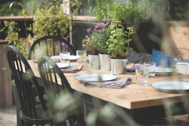 Lauko virtuvėje neapsieita be originalių akcentų. Tarkim, medinių lentynų, panašių į paveikslų rėmus. Tarp įvairiaspalvių gėlynų dėžėse dizainerė įrengė patogius suolus su pagalvėlėmis. Pagrindine sodo traukos vieta tapo natūralaus medžio valgomojo stalas bei kėdės – čia pakankamai vietos pietauti ne tik dviese, bet ir su draugais. Žinant anglų arbatos pomėgį, nenuostabu, kad dizainerė sukūrė jaukią aplinką, viliojančią mėgautis šiuo gėrimu. Victoria čia įrengė ir nedidelę pavėsinę.