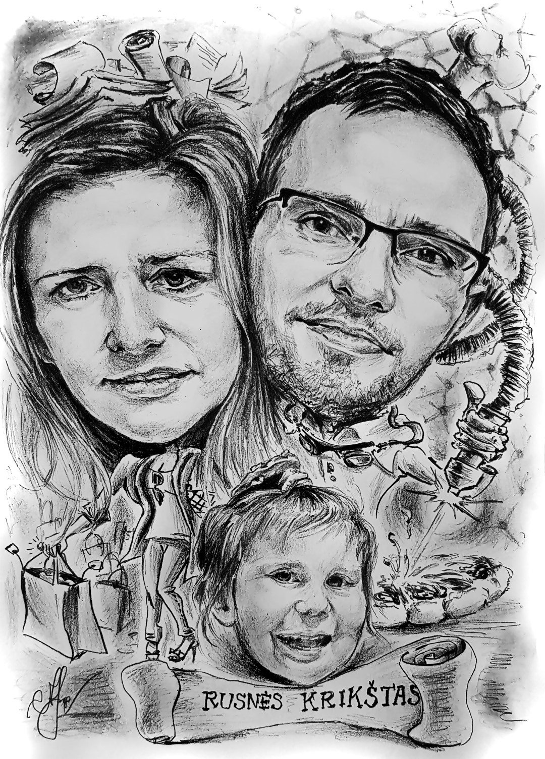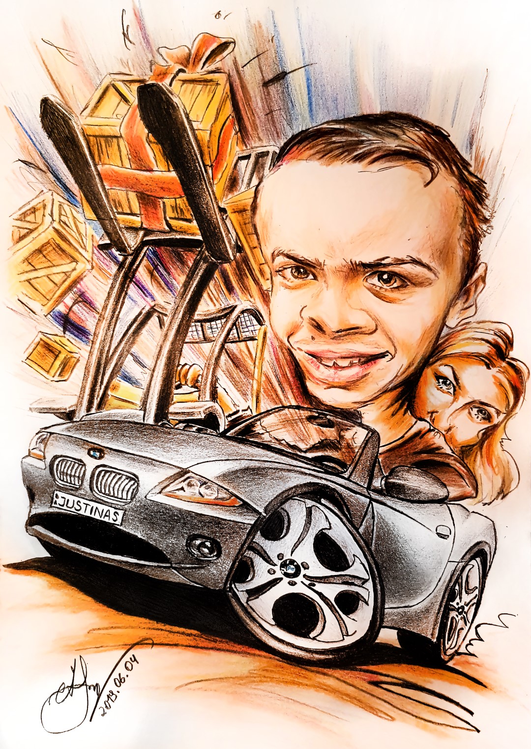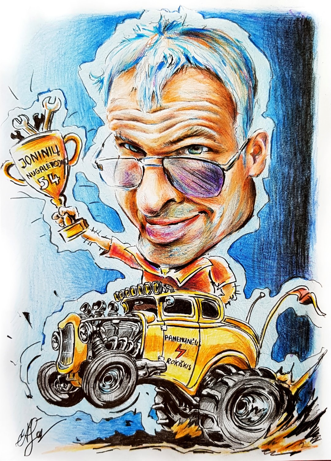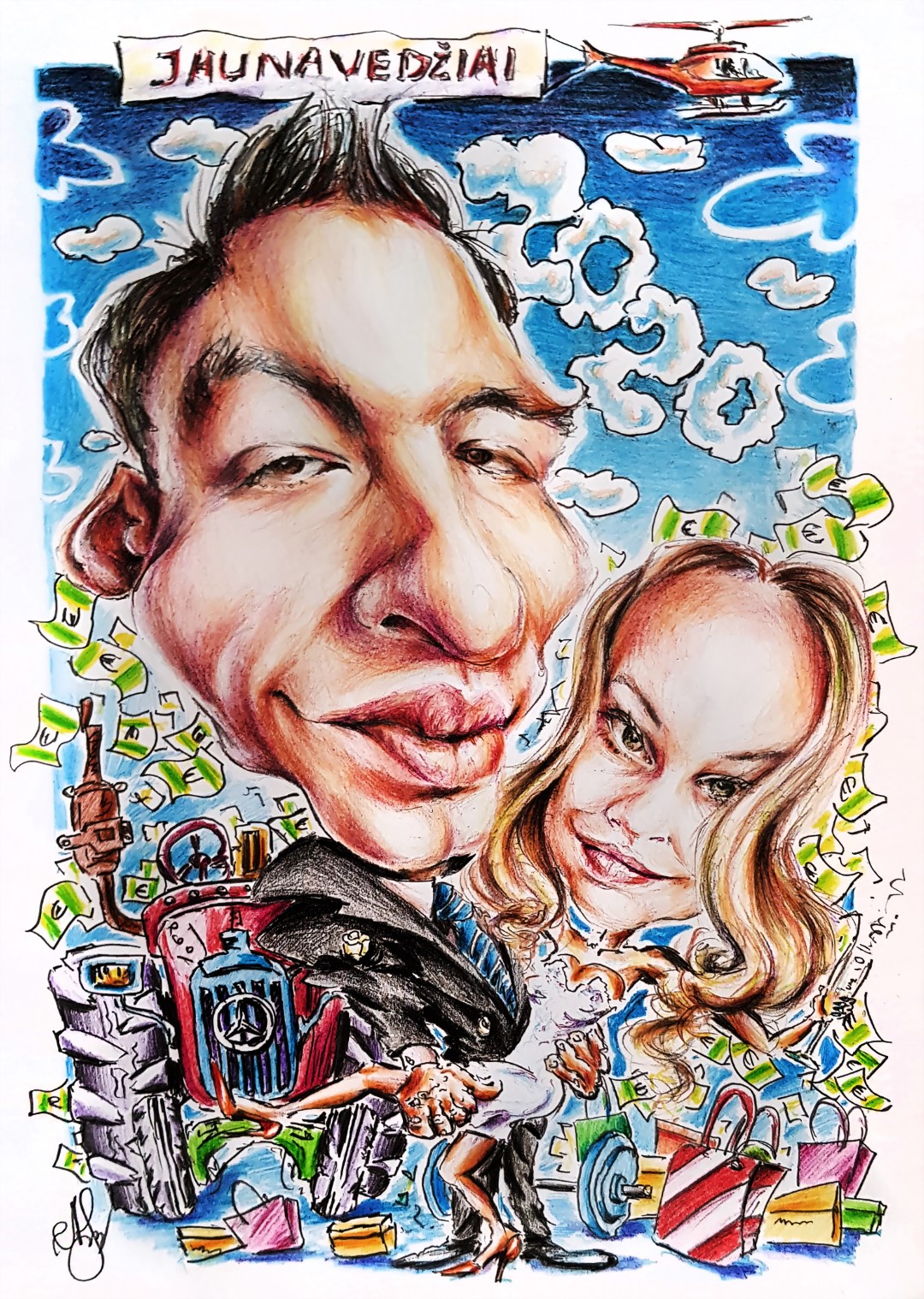 „Piešiu ne tik portretus, bet ir karikatūras. Tai leidžia sulaukti daugiau užsakymų ir pasirinkti juos pagal geresnę kainą. Su tokiais darbais man lengviau dalyvauti ir renginiuose, vestuvėse. Bet pastarieji užsakymai dabar nebedažni, juos praretino pandemija. O ir tokia naujovė dar nėra labai paplitusi Lietuvoje“, – aiškina savamokslis dailininkas.