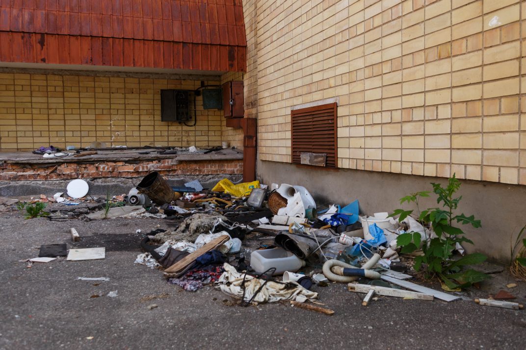 Po vienu iš balkonų patiestas čiužinys, nuo smalsių akių pridengtas lentgaliais. Kad ant jo yra miegama, išduoda šalia paliktos moteriškos šlepetės. Įspūdį, tarsi būtum atsidūręs siaubo filmo filmavimo aikštelėje, sustiprina kiečiais ir aukšta žole apaugusi teritorija – metalo vagys išlupo net nuotekų šulinių dangčius, kurie dabar uždangstyti senomis padangomis ar faneros lakštais.