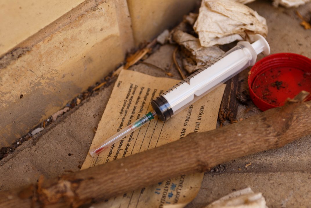 Pastato vidiniame kieme, prikrautame senų rakandų ir šiukšlių, paliktos atvertos durys. Tačiau peržengti jų slenkstį darosi nejauku – netoli įėjimo žemė nuklota dideliais medicininiais švirkštais netgi su kraujuotomis adatomis. Aplinkui mėtosi šlapimo tyrimams skirti indeliai, tušti kontrabandinių cigarečių pakeliai, galima rasti net autobuso bilietų ir prieš vienuolika metų išrašytų siuntimų tirtis sveikatą. Matyti, kad čia pat atliekami ir gamtiniai reikalai. Prieš kelerius metus šioje vietoje buvo kilęs gaisras, iki šiol mėtosi nuodėgulių krūvos.