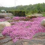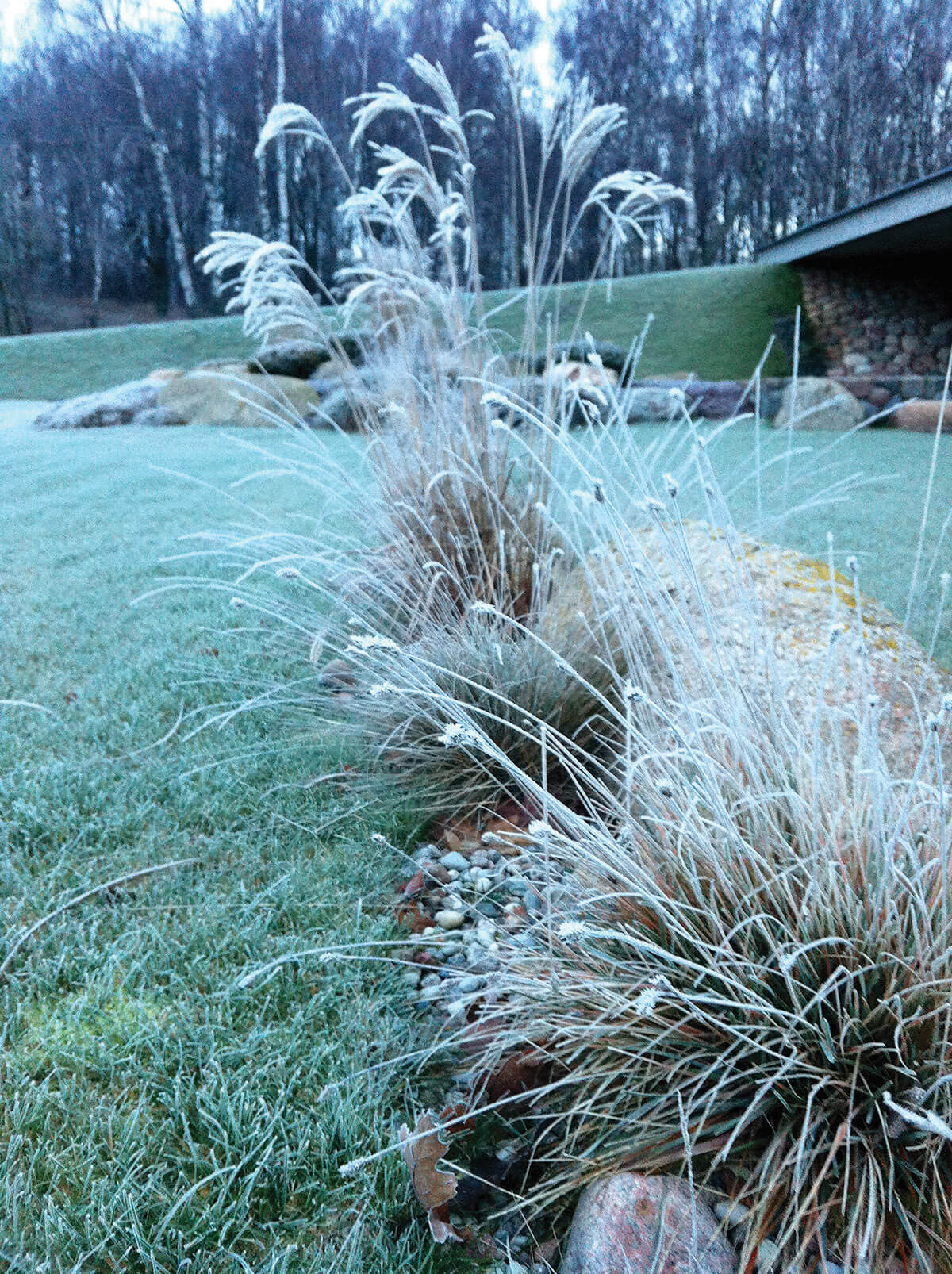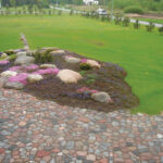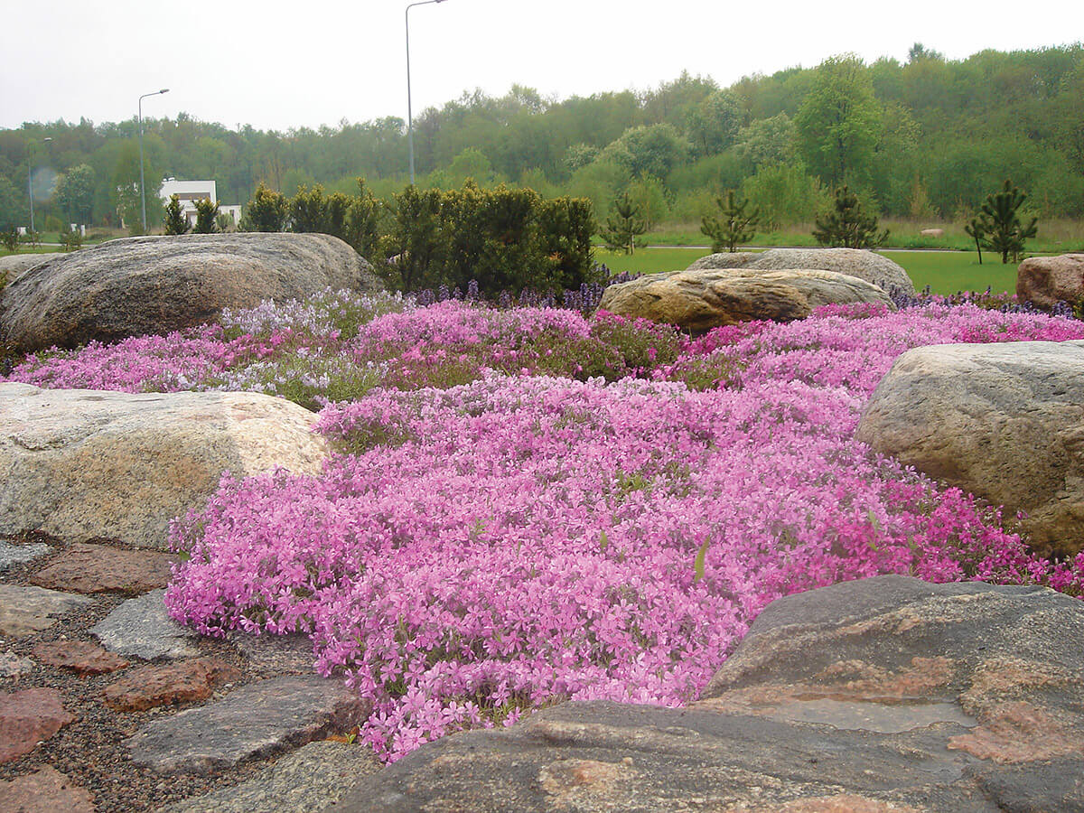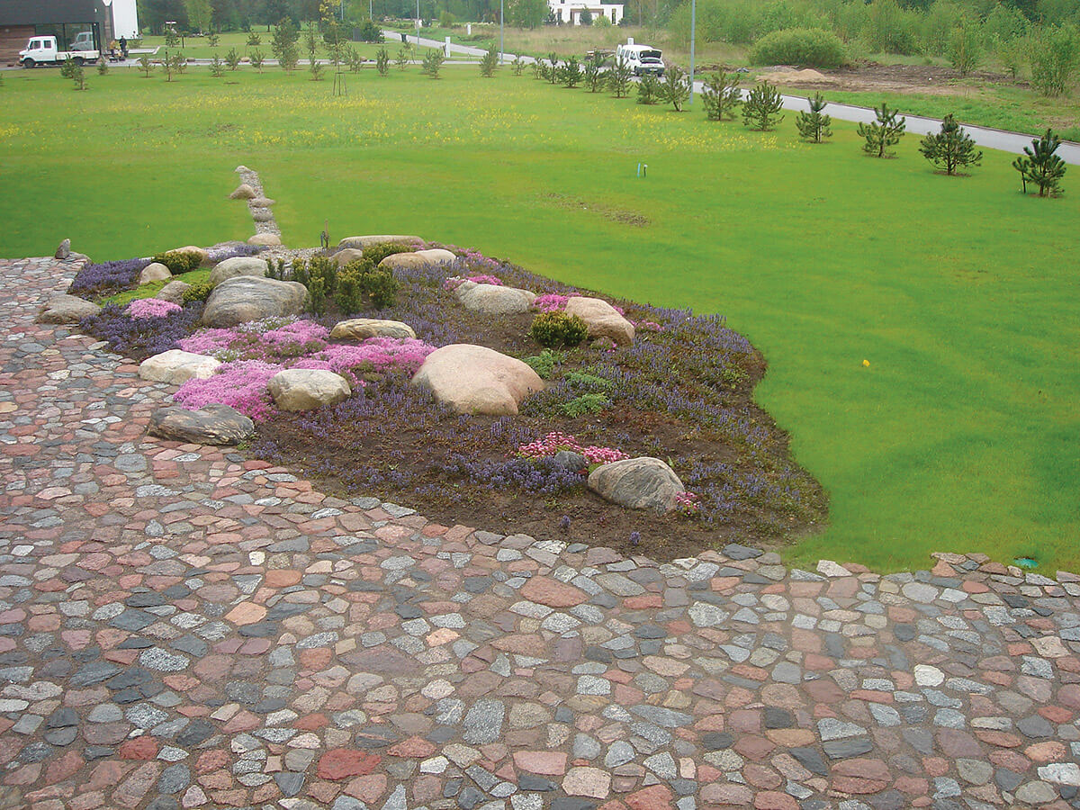 Tarp žvilgančiųjų kaulenių ir terasos, prie lauko akmenų, kūrėja nusprendė pasodinti gulsčiųjų kadagių, siūlinių žiemenių ir rožiniais žiedais žydinčių ylialapių flioksų. Visi šie augalai auga ir sklypo priekyje tarp didesnių lauko riedulių kompozicijos.