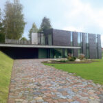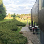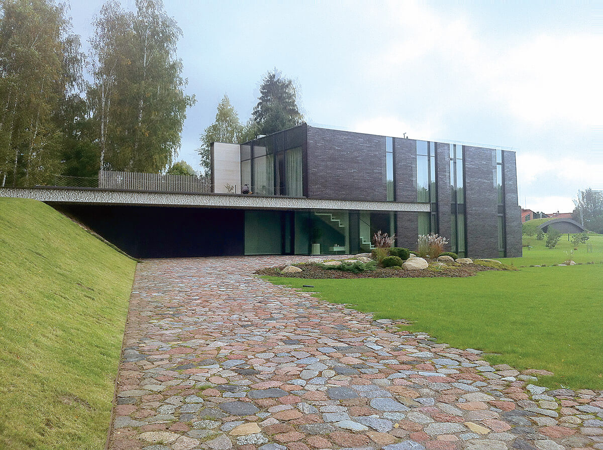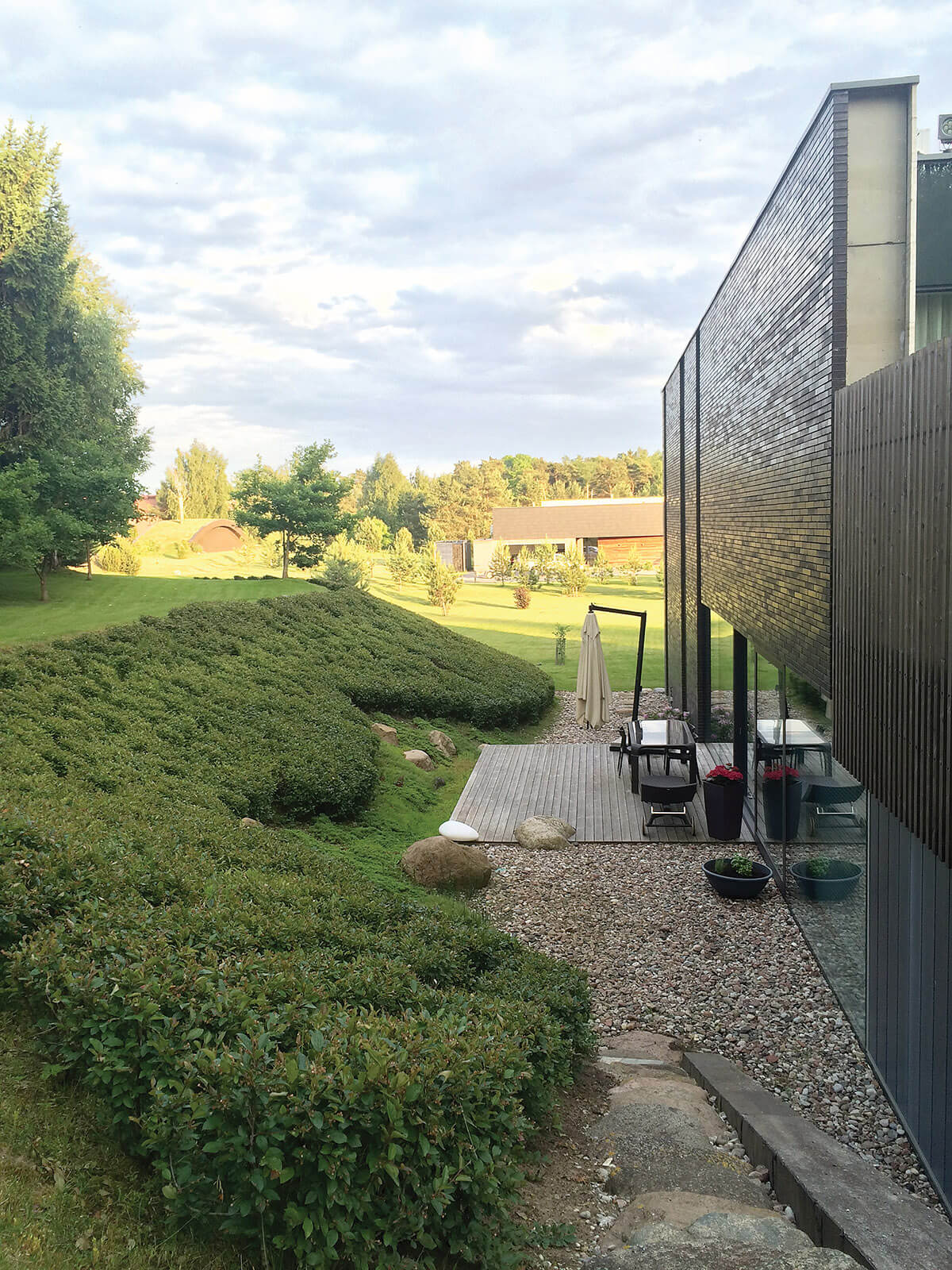 Sklypo viduryje, priešais šlaitą, architektai šeimininkams suprojektavo lauko terasą, suteikiančią privatumo ir leidžiančią mėgautis nuostabiu fonu. Kraštovaizdžio projekto autorė sako, kad tai įkvėpė mintį šlaitą „priartinti“ prie gamtos. Ji nusprendė šlaitą užsodinti žvilgančiaisiais kauleniais (Cotaneaster lucidus), kurie suteikia pakilumo, o rudenį savo spalvomis papildo beržų foną.